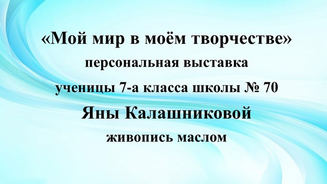 узнать их оценку со стороны, в чем-то переосмыслить их и спросить себя: в каком направлении двигаться дальше? Яна – самоучка, она нигде не обучалась технике живописи маслом. Однажды в художественном магазине Яна увидела маленький набор масляных красок и решила их приобрести. А заодно купила кисти, грунтовку, разбавитель. В первый раз Яна рисовала на маленьких фанерах, а уже позже на холсте. Её первая работа называлась «Лунная дорожка». Больше всего Яне нравится писать пейзажи, природу, ночное небо, делать мягкие переходы цвета, чувствовать силу цвета.