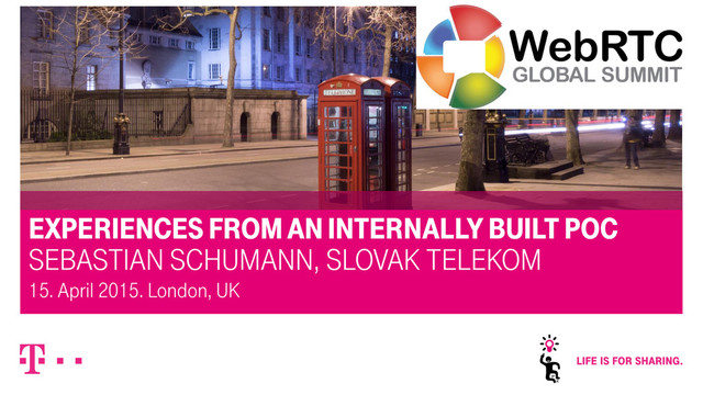 concept implementation Service description Used technologies and integration challenges Lessons learned April 2015, London, UK S. Schumann: “Post-Launch Experiences From An Internally Developed PoC”, WebRTC Global Summit 2 @s_schumann Feedback is welcome! Get in touch during/after the event.