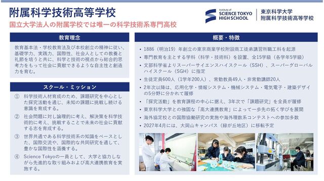 東京科学大学 附属科学技術高等学校についてご紹介します。 附属科学技術高等学校は、国立大学法人の附属学校では唯一の工業系専門高校です。東京科学大学(Science Tokyo)の附属学校として、大学と連携した教育実践・研究を進めており、卒業生の多くは大学に進学し、研究者や技術者など、企業や教育界など各界に有為な人材を送り出しています。