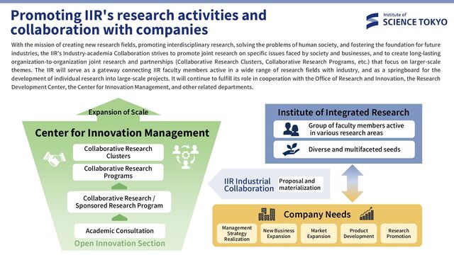 The IIR(Institute of Integrated Research) will serve as a gateway connecting IIR faculty members active in a wide range of research fields with industry, and as a springboard for the development of individual research into large-scale projects. It will continue to fulfill its role in cooperation with the Office of Research and Innovation, the Research Development Center, the Center for Innovation Management, and other related departments.