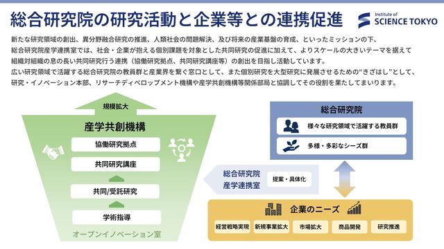 東京科学大学 総合研究院 産学連携室では、広い研究領域で活躍する総合研究院の教員群と産業界を繋ぐ窓口として、また個別研究を大型研究に発展させるための"きざはし"として、関係部局と協調してその役割を果たしてまいります。具体的な研究協力の方法として、様々な制度が用意されていますので、ご相談ください。