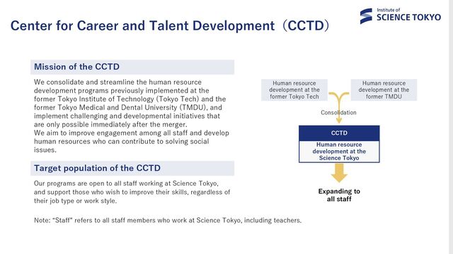 the human resource development programs previously implemented at the former Tokyo Institute of Technology (Tokyo Tech) and the former Tokyo Medical and Dental University (TMDU), and implement challenging and developmental initiatives that are only possible immediately after the merger. We aim to improve engagement among all staff and develop human resources who can contribute to solving social issues. Human resource development at the former Tokyo Tech Human resource development at the former TMDU Human resource development at the Science Tokyo CCTD Consolidation Expanding to all staff Mission of the CCTD Target population of the CCTD Our programs are open to all staff working at Science Tokyo, and support those who wish to improve their skills, regardless of their job type or work style. Note: “Staff” refers to all staff members who work at Science Tokyo, including teachers.
