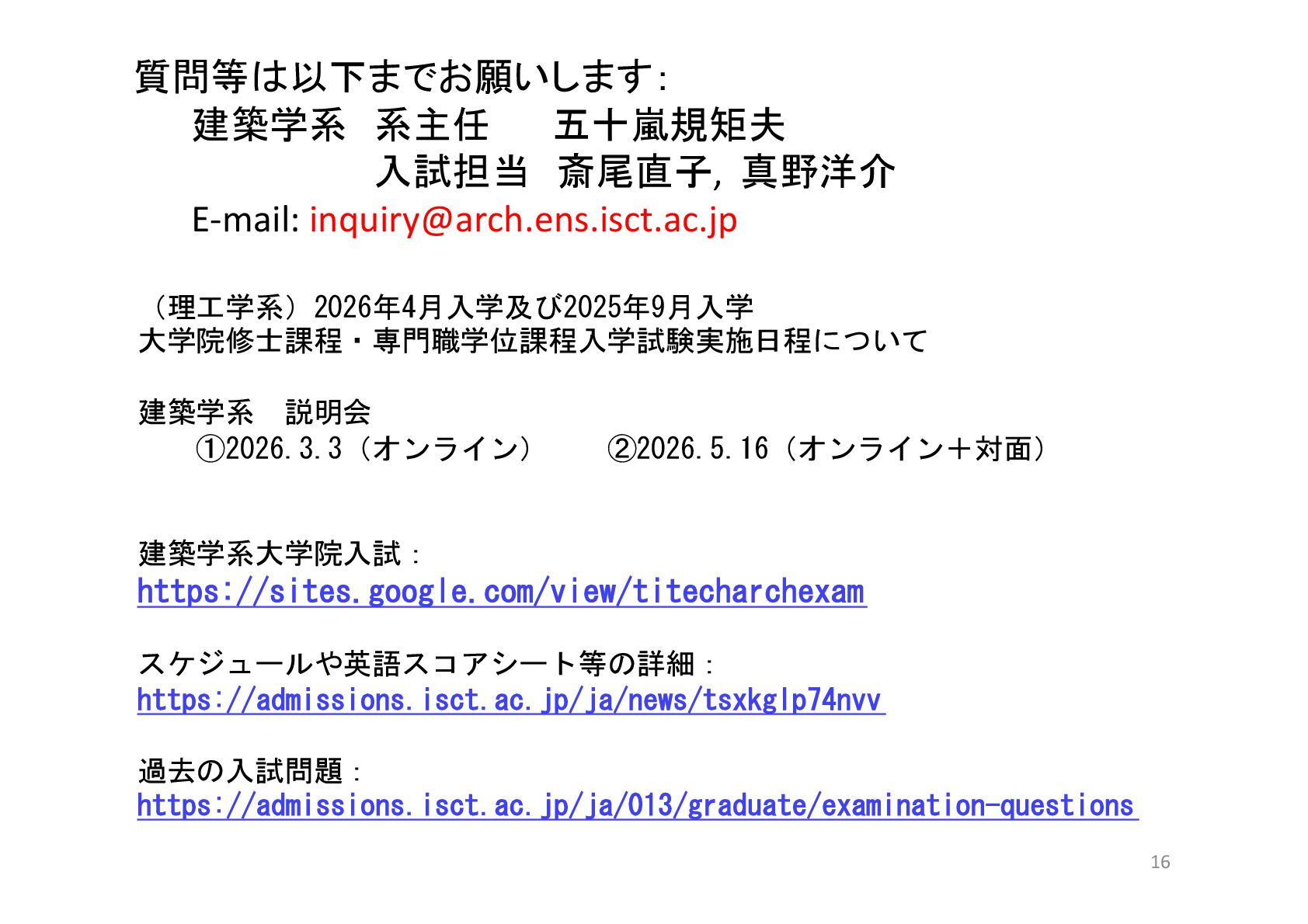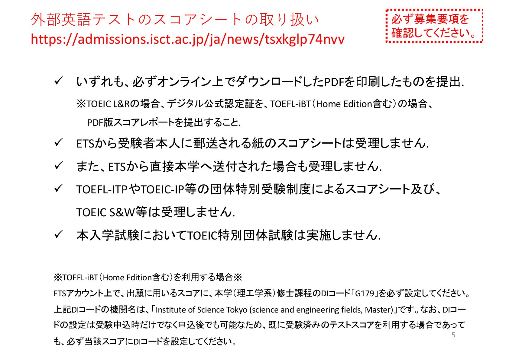 また、ETSから直接本学へ送付された場合も受理しません. ü TOEFL-ITPやTOEIC-IP等の団体特別受験制度によるスコアシート及び、 TOEIC S&W等は受理しません. ü 本入学試験においてTOEIC特別団体試験は実施しません. ※TOEFL-iBT(Home Edition含む)を利用する場合※ ETSアカウント上で、出願に用いるスコアに、本学(理工学系)修士課程のDIコード「G179」を必ず設定してください。 上記DIコードの機関名は、「Institute of Science Tokyo (science and engineering fields, Master)」です。なお、DIコー ドの設定は受験申込時だけでなく申込後でも可能なため、既に受験済みのテストスコアを利用する場合であって も、必ず当該スコアにDIコードを設定してください。 5 https://admissions.isct.ac.jp/ja/news/tsxkglp74nvv 必ず募集要項を 確認してください。