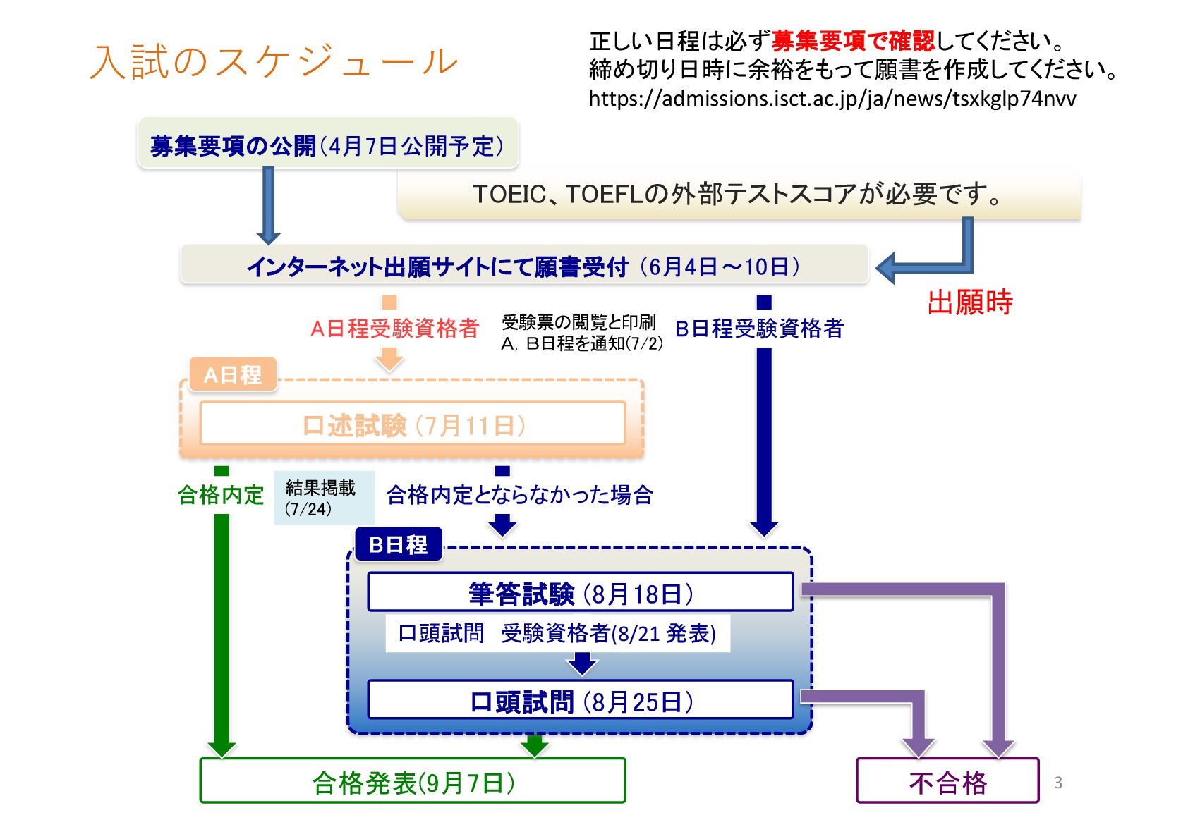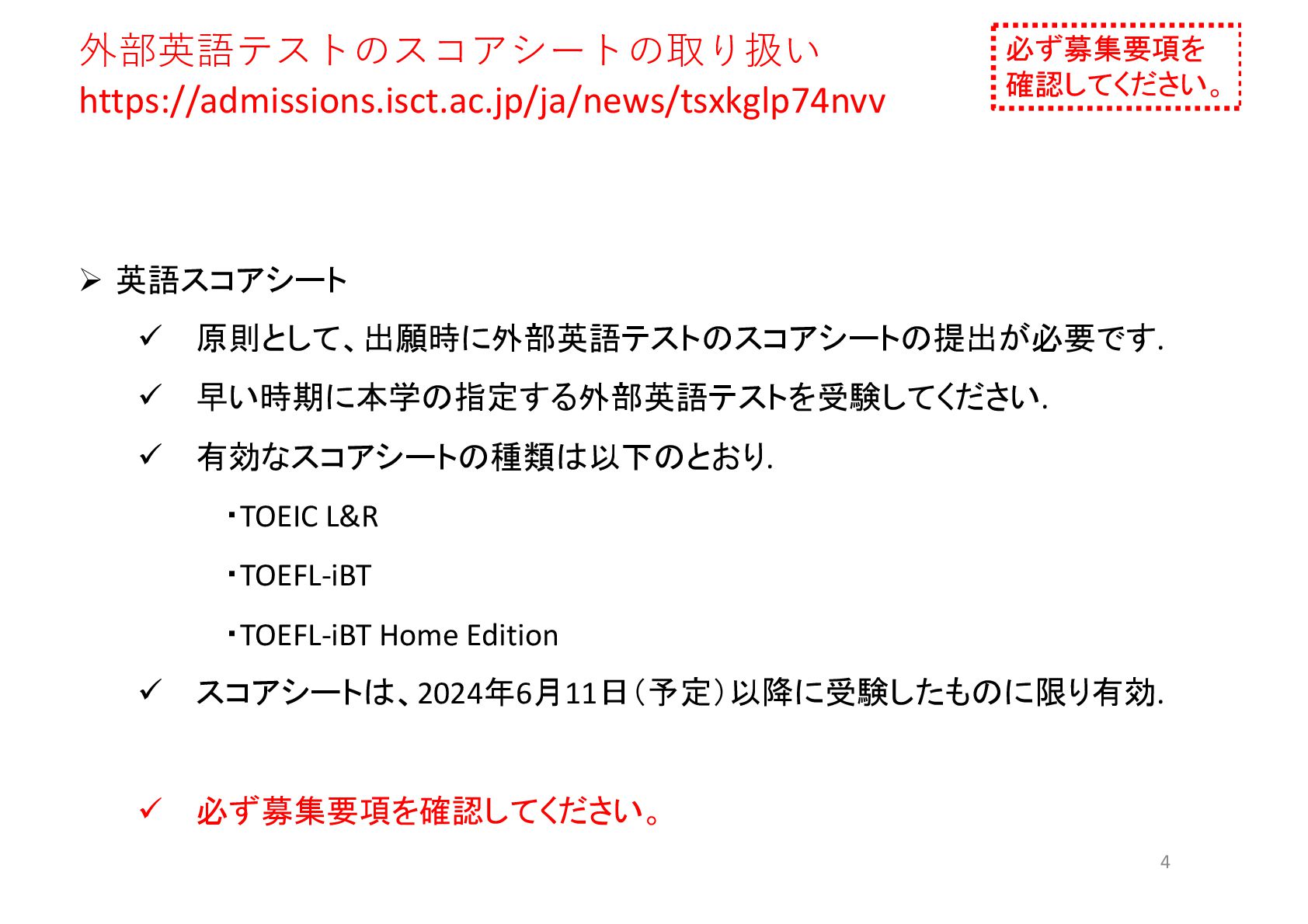 ・TOEFL-iBT ・TOEFL-iBT Home Edition ü スコアシートは、2024年6月11日(予定)以降に受験したものに限り有効. ü 必ず募集要項を確認してください。 4 外部英語テストのスコアシートの取り扱い https://admissions.isct.ac.jp/ja/news/tsxkglp74nvv 必ず募集要項を 確認してください。