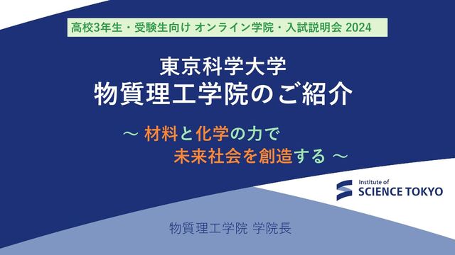 物質理工学院 ~材料と化学の力で未来社会を創造する~ 物質理工学院で行われている世界を先導する研究に触れ、その一端を担って下さい。 そして、物質・材料開発を主導できる研究者・技術者として、世界で活躍してください。 本学院への入学をお待ちしています。