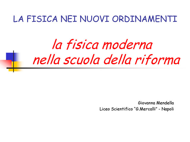 universitari: … la fisica ha goduto finora di scarsa considerazione nella formazione scolastica... … i ragazzi arrivano all‟università privi della conoscenza dei concetti più elementari, perché la fisica classica viene insegnata superficialmente … … l‟insegnamento della Matematica e della Fisica nella scuola attuale è demoralizzante e demotivante ... … sarebbe già tanto se si insegnassero le basi della fisica, andrebbero ben digeriti i concetti di base della fisica classica, piuttosto che ampliare i programmi esistenti … … su quali basi si potrebbe fondare l'insegnamento della fisica moderna?... … dove sono gli insegnanti in grado di insegnare la fisica moderna? …