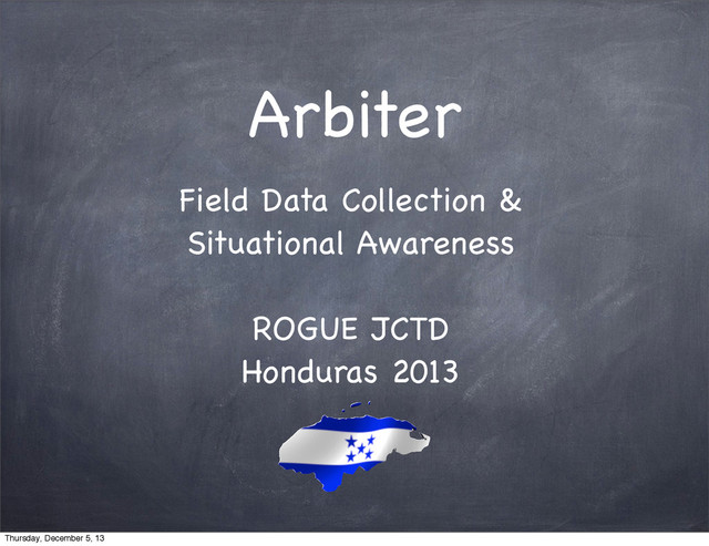 Lightning talk for Arbiter given at the November GeoDC Meetup: http://www.meetup.com/Geo-DC/events/135786842/