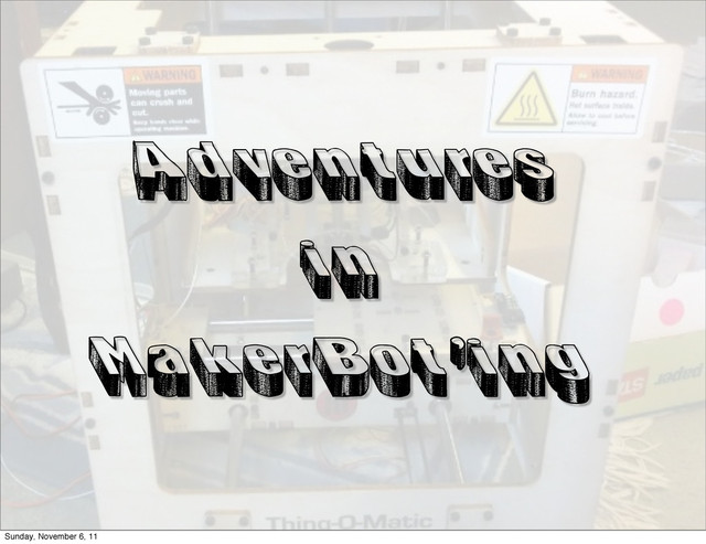 A presentation I gave a few times to local 3-D printer user groups in Boston, as well as internal company meetings at Roundarch Isobar about the possibilities of DIY fabrication using plastic, and other materials.