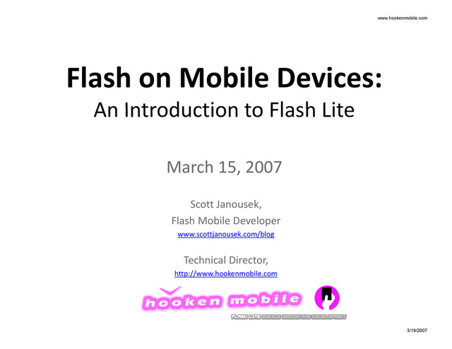 Introduction to Flash Lite March 15, 2007 Scott Janousek, Flash Mobile Developer www.scottjanousek.com/blog Technical Director, http://www.hookenmobile.com www.hookenmobile.com 3/19/2007