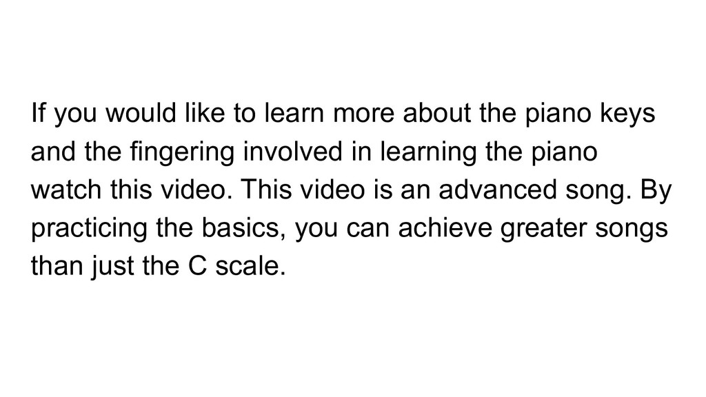 keys and the fingering involved in learning the piano watch this video. This video is an advanced song. By practicing the basics, you can achieve greater songs than just the C scale.