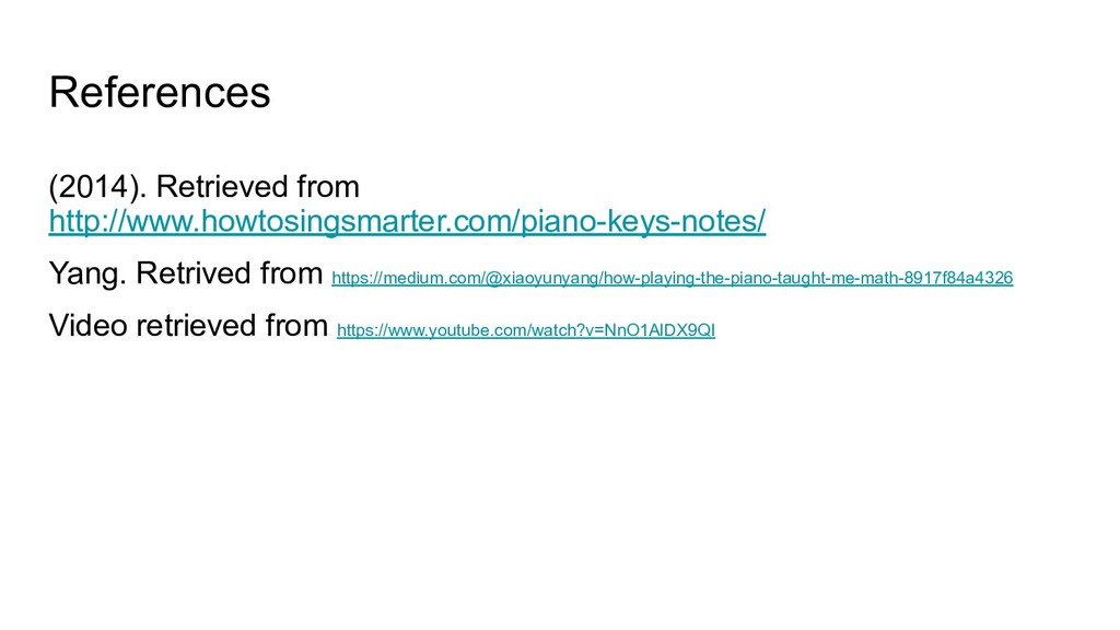 References (2014). Retrieved from http://www.howtosingsmarter.com/piano-keys-notes/ Yang. Retrived from https://medium.com/@xiaoyunyang/how-playing-the-piano-taught-me-math-8917f84a4326 Video