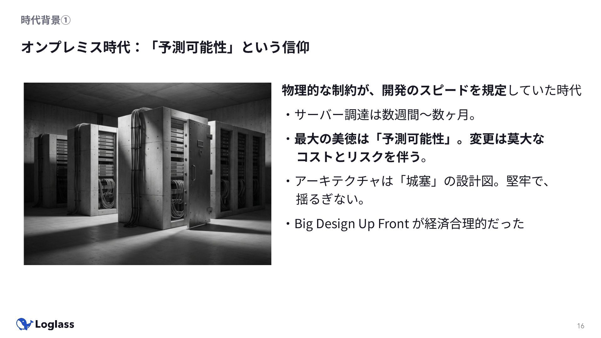 16 時代背景① オンプレミス時代:「予測可能性」という信仰 物理的な制約が、開発のスピードを規定していた時代 ‧サーバー調達は数週間〜数ヶ⽉。 ‧最⼤の美徳は「予測可能性」。変更は莫⼤な コストとリスクを伴う。 ‧アーキテクチャは「城塞」の設計図。堅牢で、 揺るぎない。 ‧Big