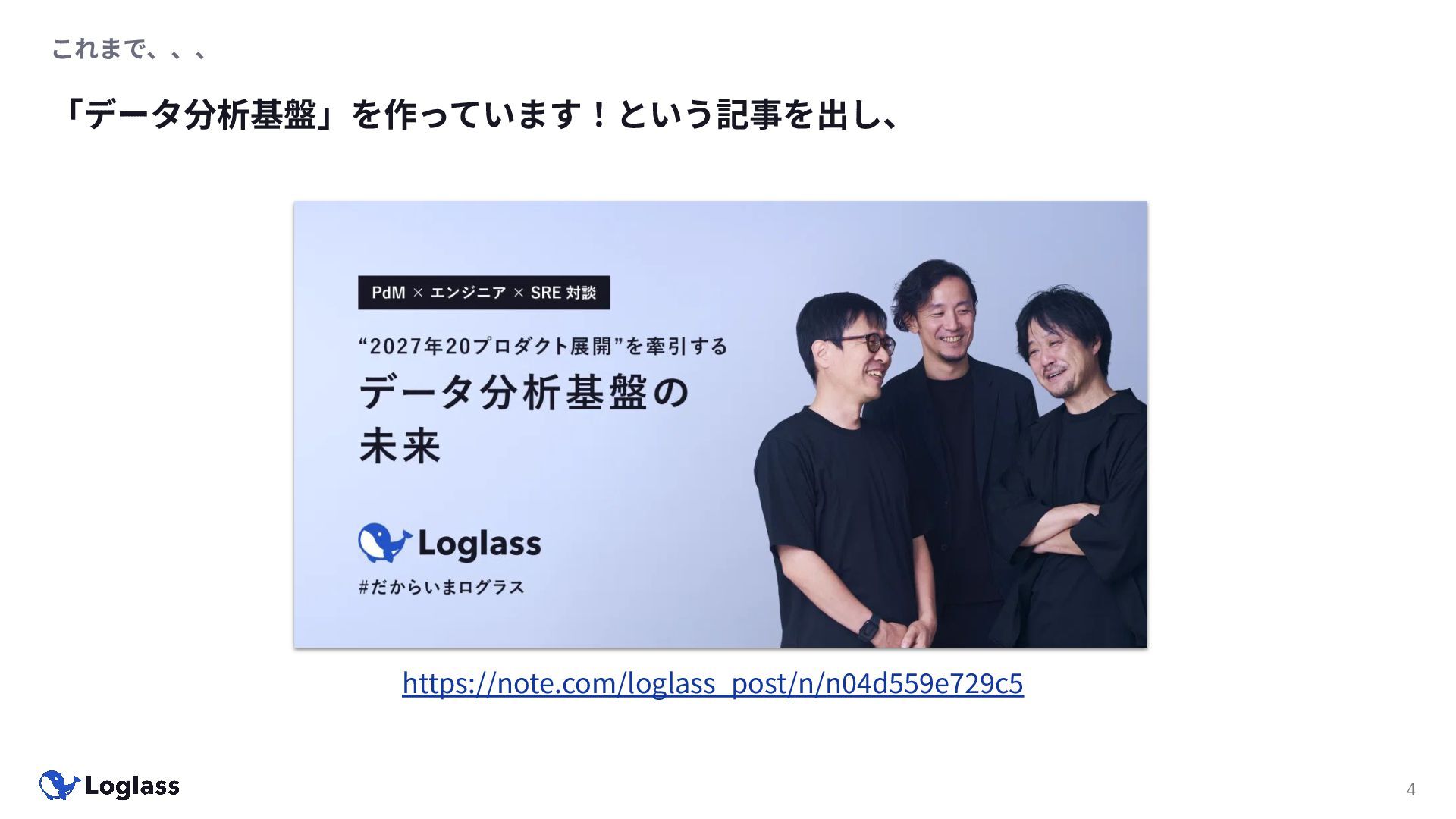 これまで、、、 「データ分析基盤」を作っています!という記事を出し、 https://note.com/loglass_post/n/n04d559e729c5 4