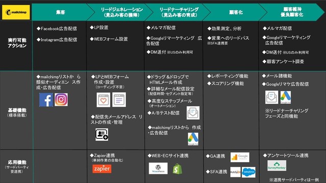 基礎機能 (標準搭載) ◆Facebook広告配信 ◆Instagram広告配信 ◆LP設置 ◆Googleリマーケティング 広 告配信 ◆WEBフォーム設置 ◆メルマガ配信 ◆営業へのリードパス ※SFA連携要 ◆DM送付 ※USのみ利用可 ◆スコアリング機能 ◆レポーティング機能 ◆SFA連携 ◆mailchimpリストか ら 類似オーディエン ス作 成・広告配信 ◆LPとWEBフォーム 作成・設置 (コーディング不要) ◆顧客アンケート調査 応用機能 (サードパーティ 要連携) ◆WEB・ECサイト連携 ◆GA連携 ◆Zapier連携 (単純作業の自動化) ◆アンケートツール連携 ◆配信先メールアドレス リ ストの作成・管理 ◆メール諸機能 ◆DM送付 ※USのみ利用可 ◆Googleリマーケティング 広告配信 ◆メルマガ配信 ◆効果測定、分析 ◆高度なステップメール (オートメーション) ◆詳細なメール配信設定 (配信時間・セグメント指定等) ◆mailchimpリストから 作成 ・広告配信 ◆A/Bテスト配信 ◆ドラッグ&ドロップで HTMLメール作成 ◆Googleリマケ広告配信 ※リードナーチャリング フェーズと同機能 ※連携サードパーティは一例