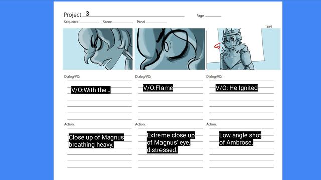 Ambrose moving is sword to face Magnus. Extreme close up of Ambrose’s eyes panning down to his mouth. Ambrose speaks but the audience doesn’t hear what he says.