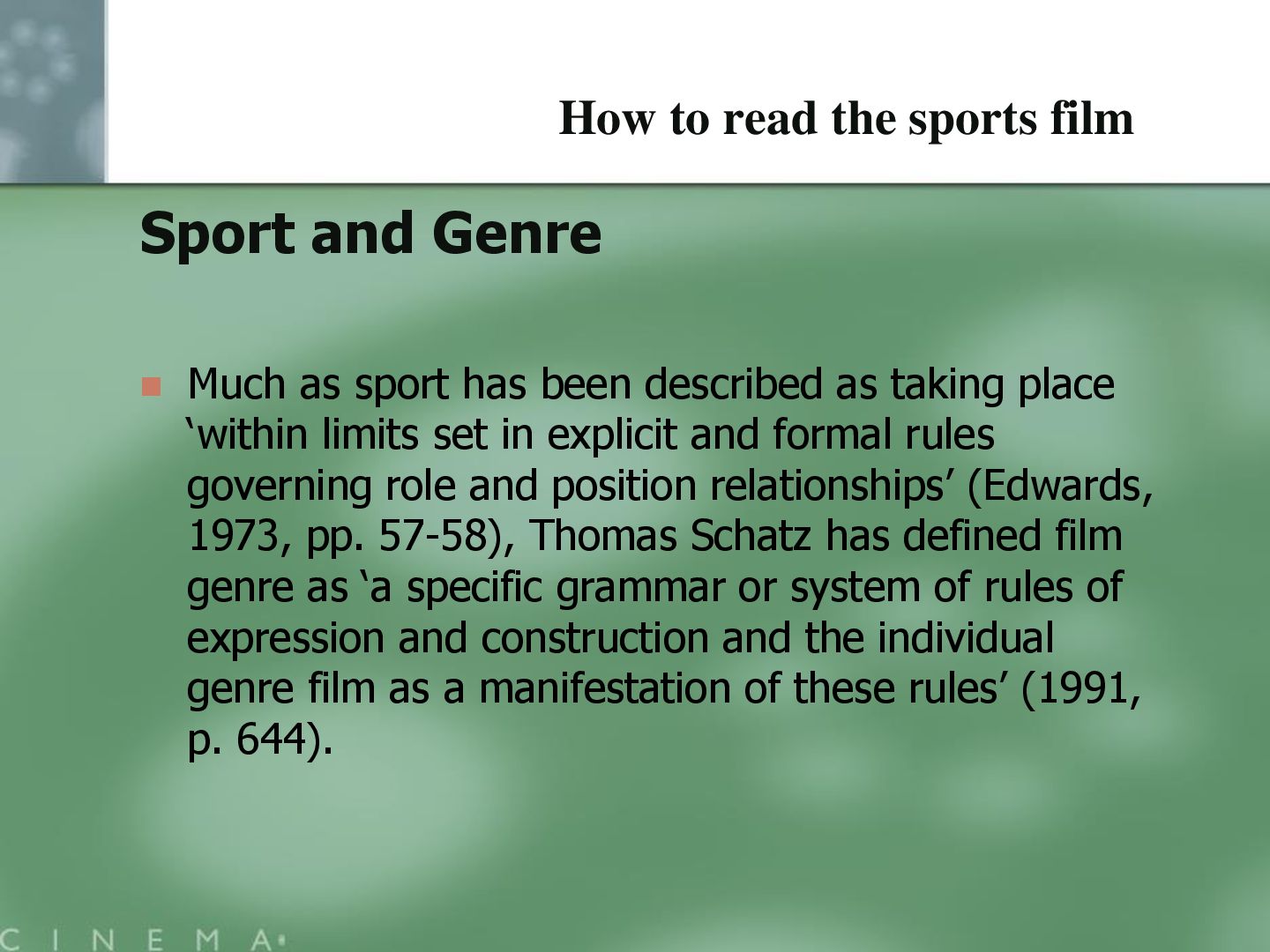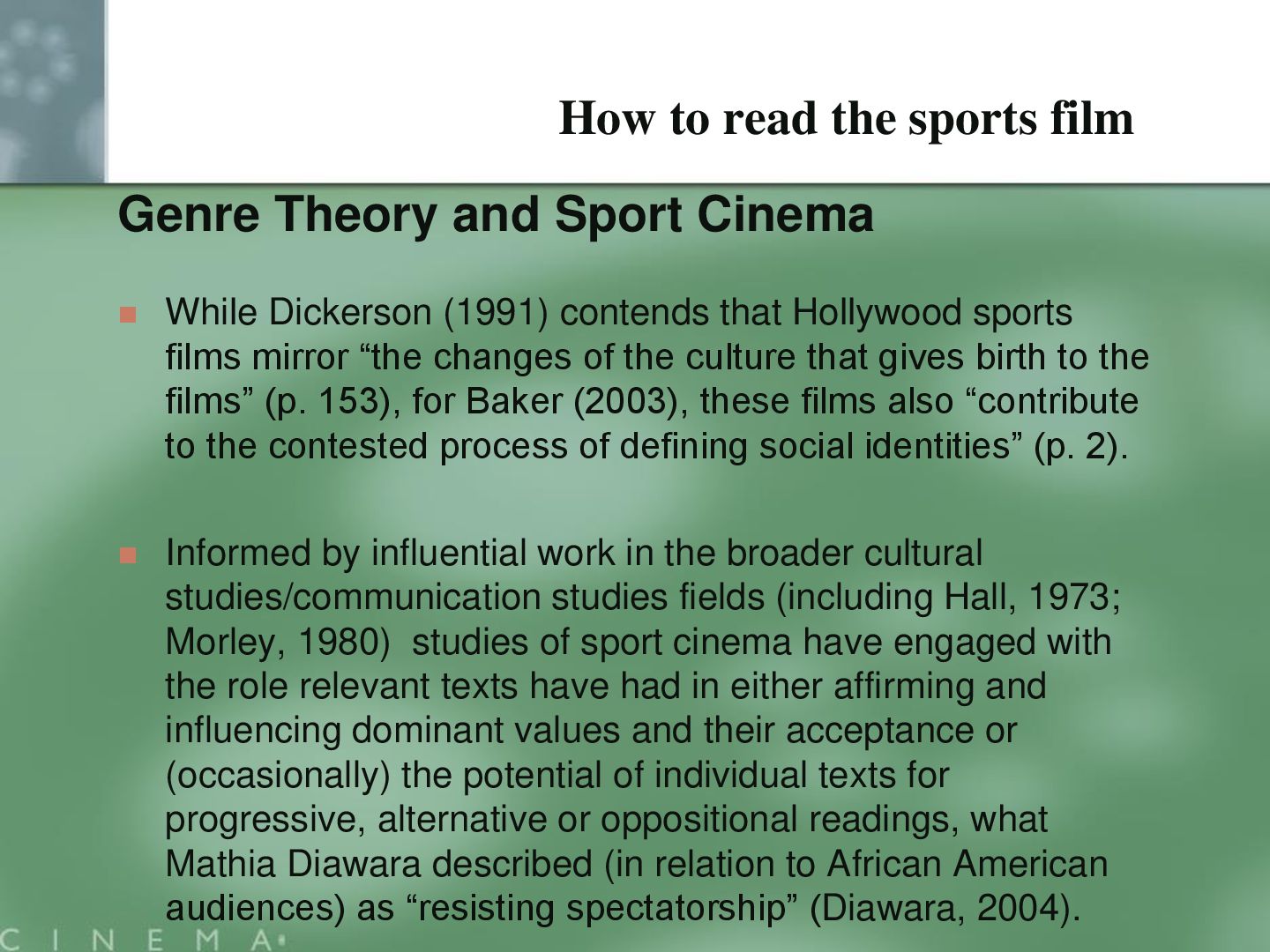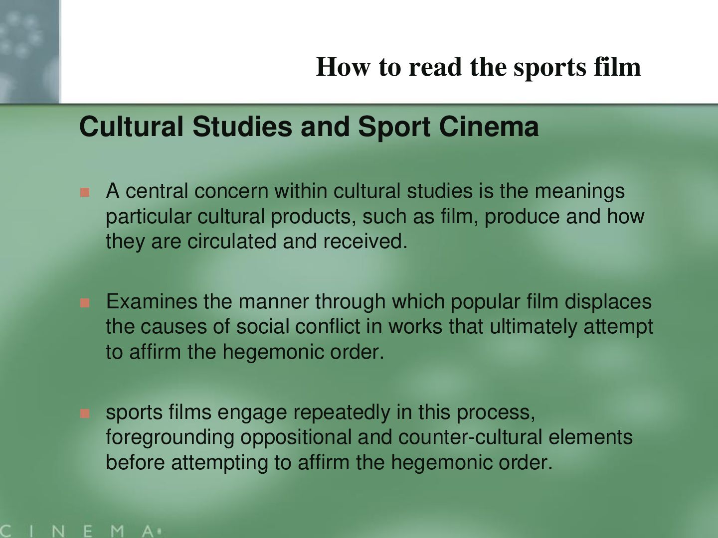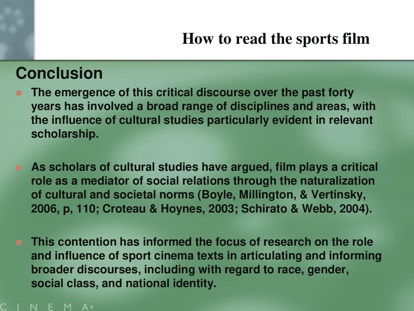 of this critical discourse over the past forty years has involved a broad range of disciplines and areas, with the influence of cultural studies particularly evident in relevant scholarship. As scholars of cultural studies have argued, film plays a critical role as a mediator of social relations through the naturalization of cultural and societal norms (Boyle, Millington, & Vertinsky, 2006, p, 110; Croteau & Hoynes, 2003; Schirato & Webb, 2004). This contention has informed the focus of research on the role and influence of sport cinema texts in articulating and informing broader discourses, including with regard to race, gender, social class, and national identity.