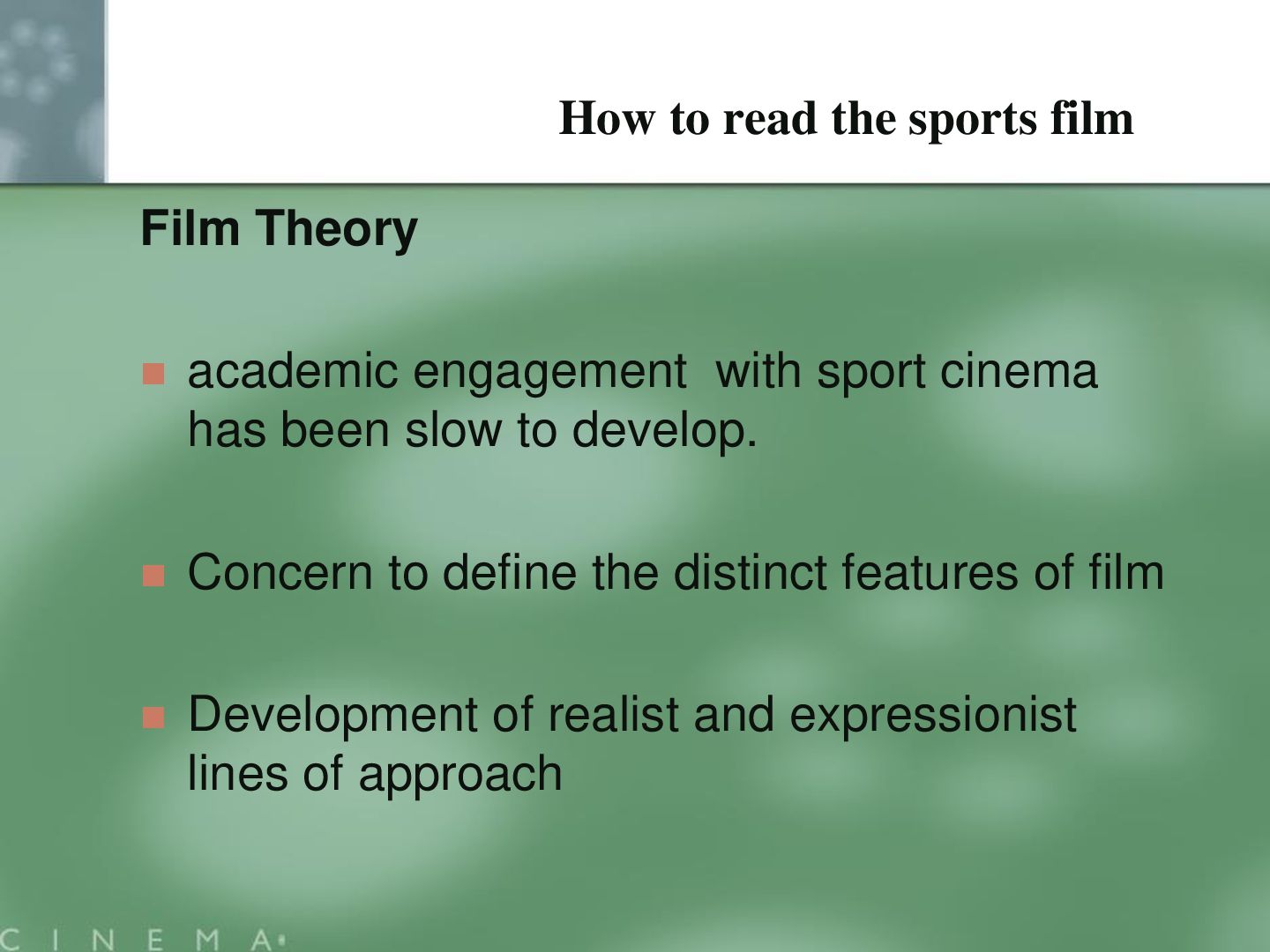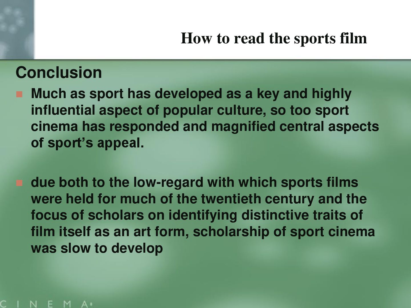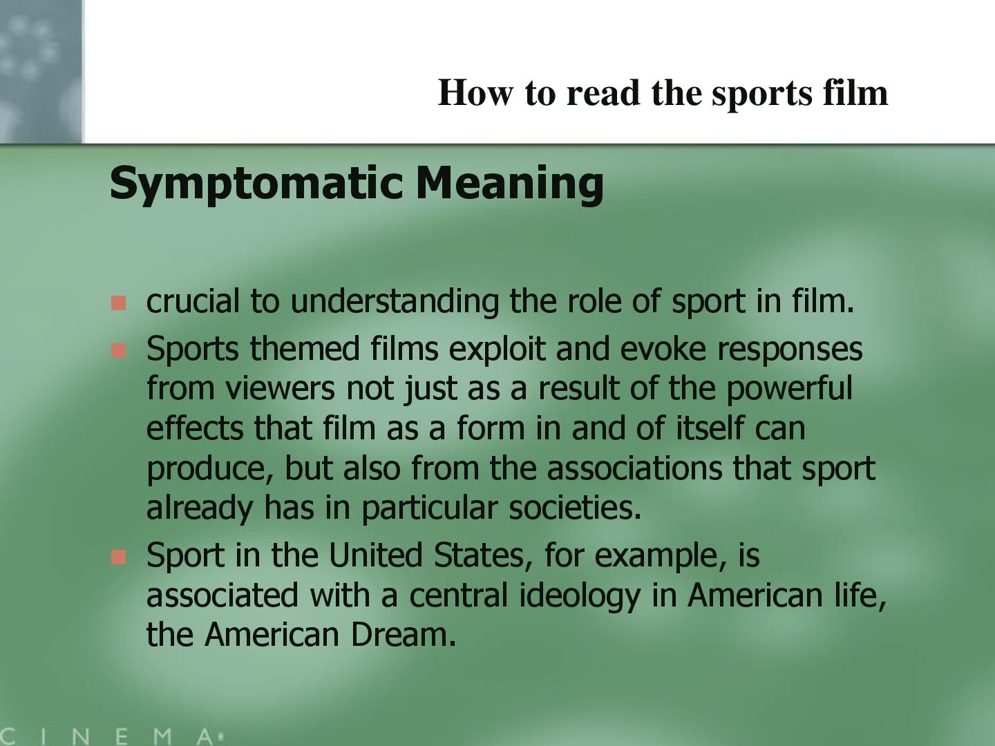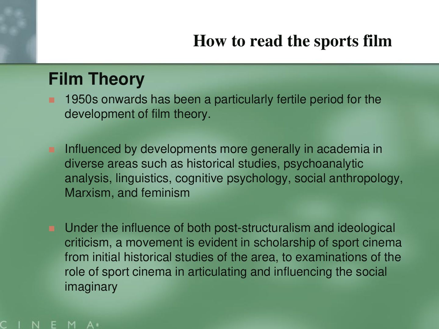 of this critical discourse over the past forty years has involved a broad range of disciplines and areas, with the influence of cultural studies particularly evident in relevant scholarship. As scholars of cultural studies have argued, film plays a critical role as a mediator of social relations through the naturalization of cultural and societal norms (Boyle, Millington, & Vertinsky, 2006, p, 110; Croteau & Hoynes, 2003; Schirato & Webb, 2004). This contention has informed the focus of research on the role and influence of sport cinema texts in articulating and informing broader discourses, including with regard to race, gender, social class, and national identity.