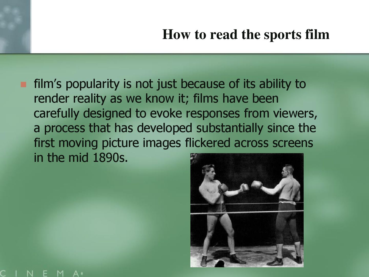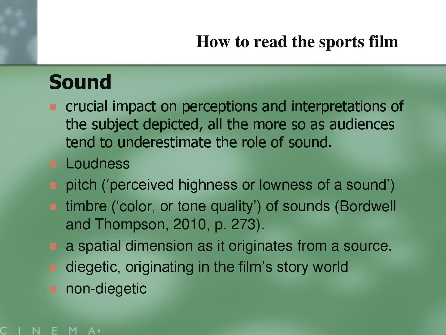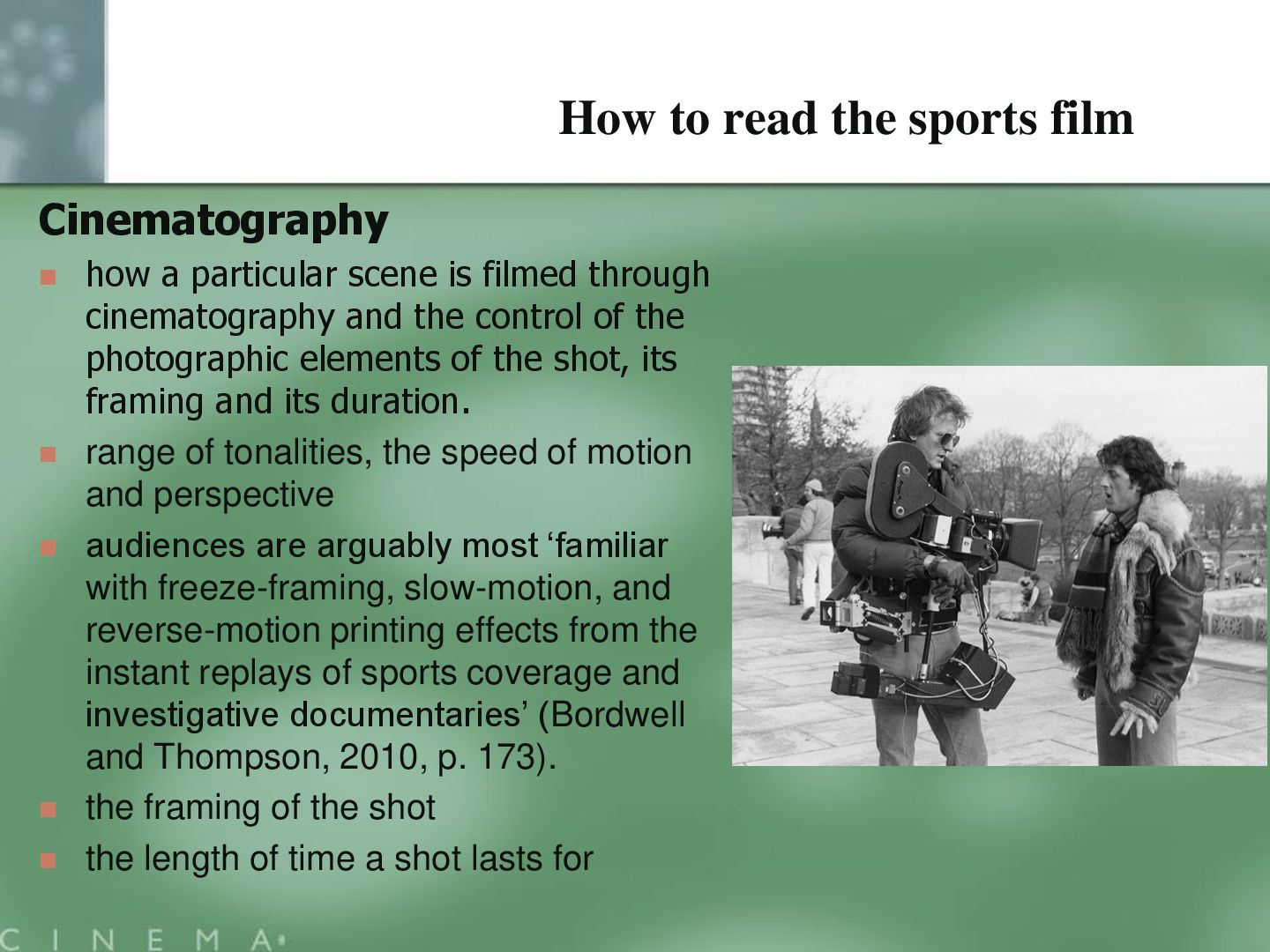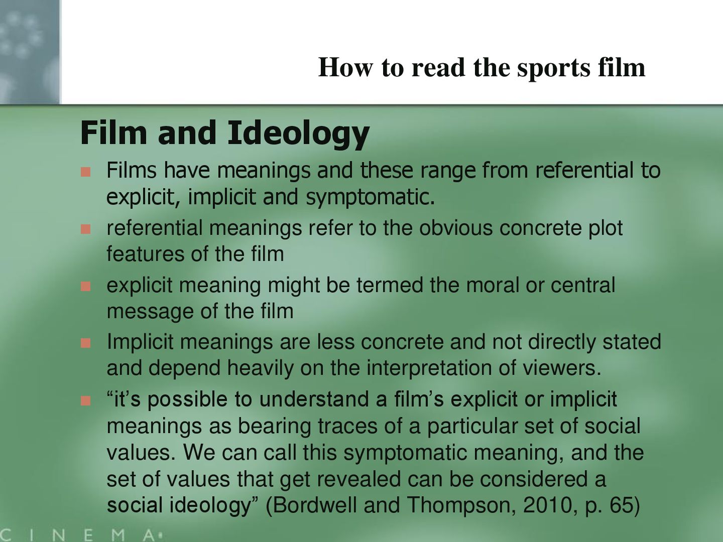 of this critical discourse over the past forty years has involved a broad range of disciplines and areas, with the influence of cultural studies particularly evident in relevant scholarship. As scholars of cultural studies have argued, film plays a critical role as a mediator of social relations through the naturalization of cultural and societal norms (Boyle, Millington, & Vertinsky, 2006, p, 110; Croteau & Hoynes, 2003; Schirato & Webb, 2004). This contention has informed the focus of research on the role and influence of sport cinema texts in articulating and informing broader discourses, including with regard to race, gender, social class, and national identity.