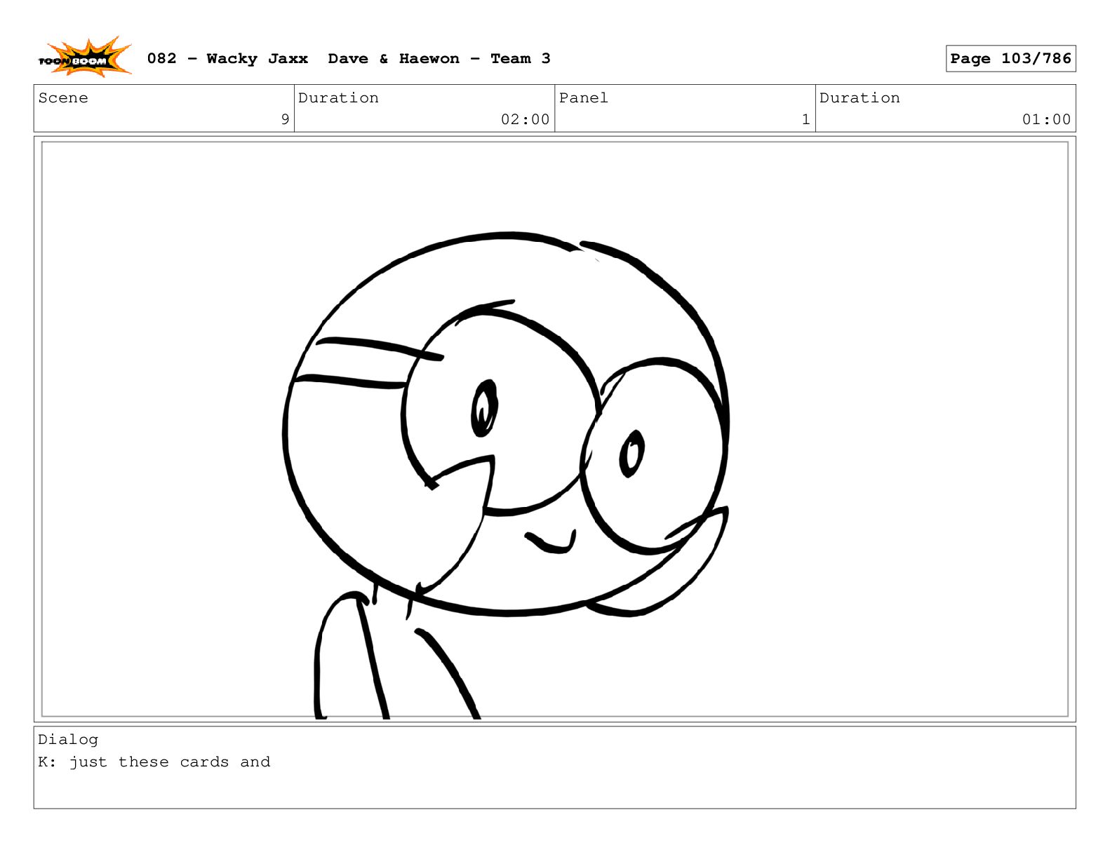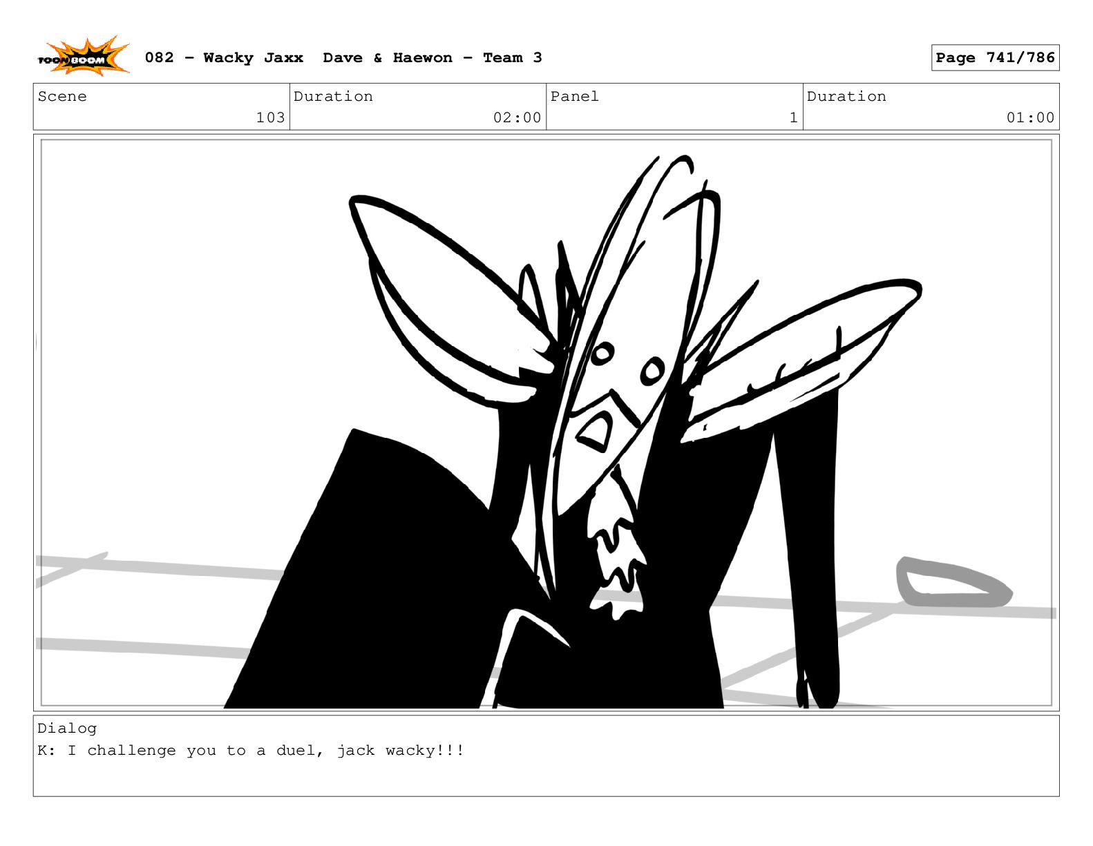 Scene 103 Duration 02:00 Panel 1 Duration 01:00 Dialog K: