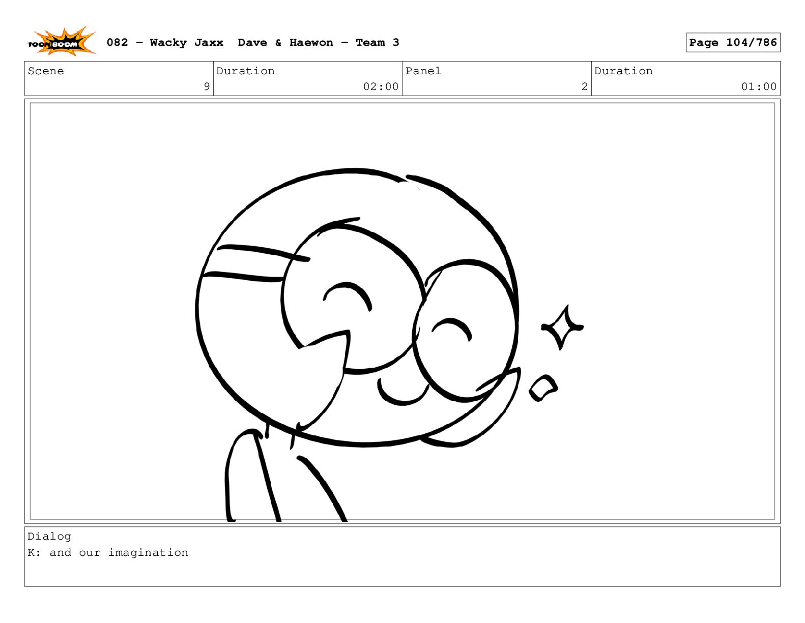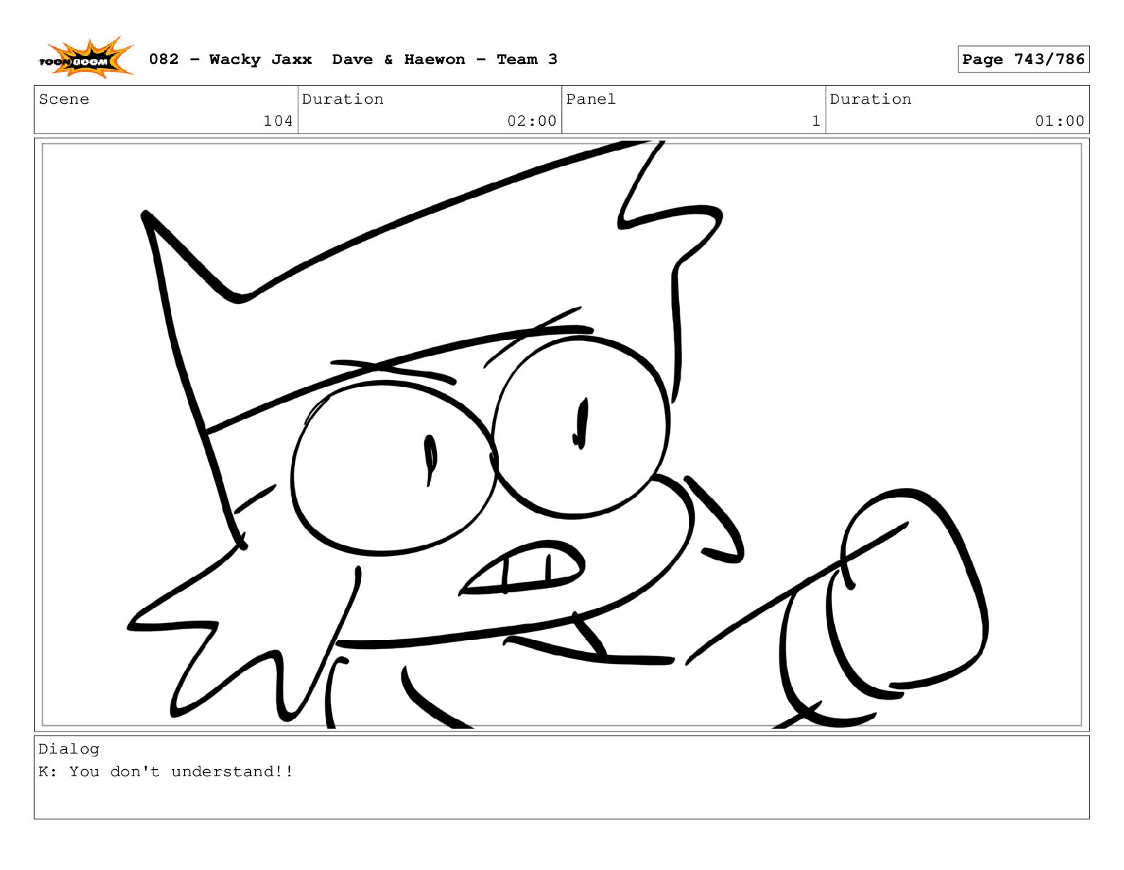 Scene 104 Duration 02:00 Panel 1 Duration 01:00 Dialog K: