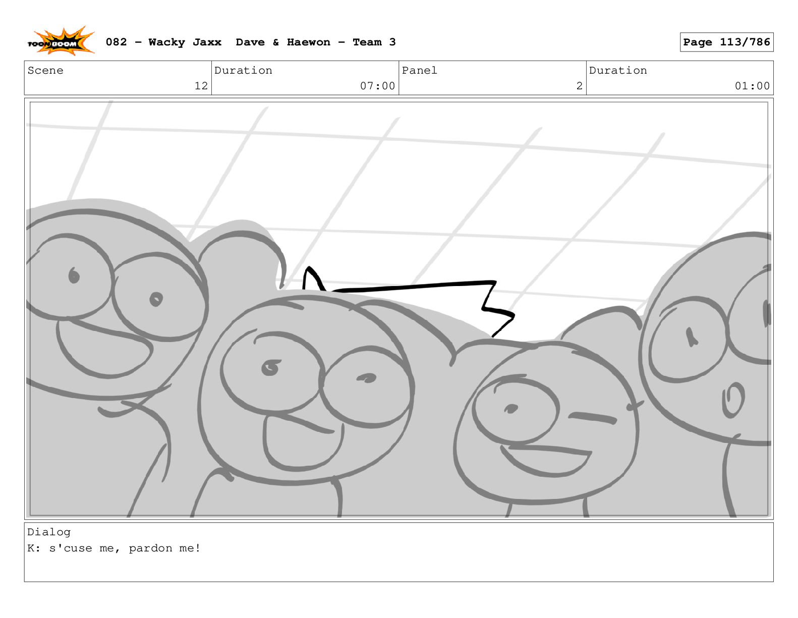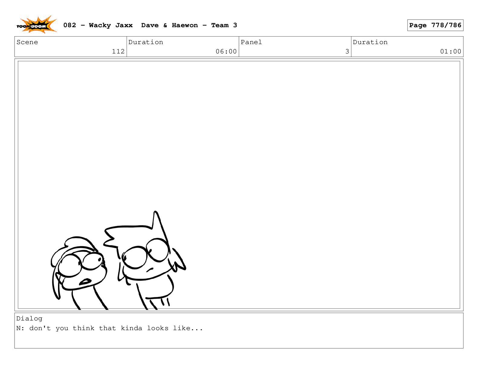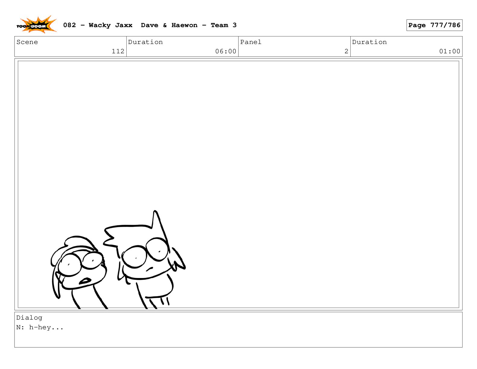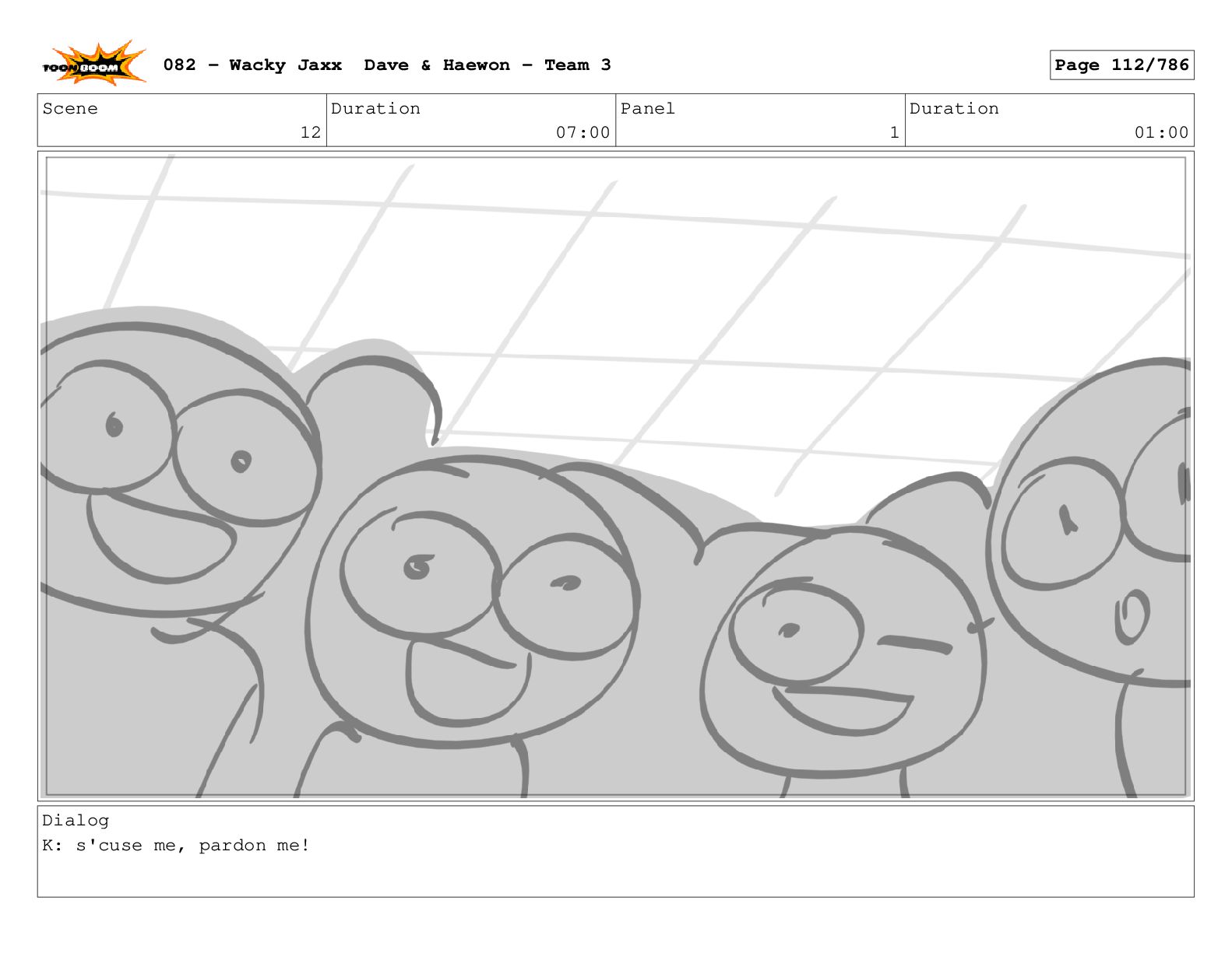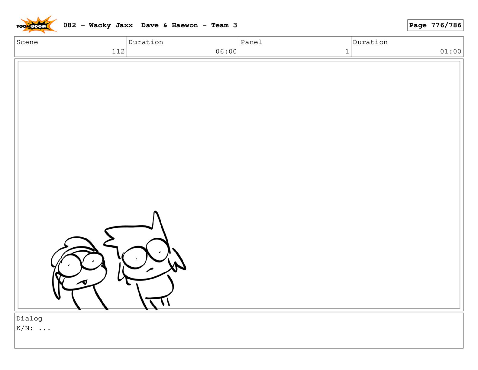 Scene 112 Duration 06:00 Panel 1 Duration 01:00 Dialog K/N: