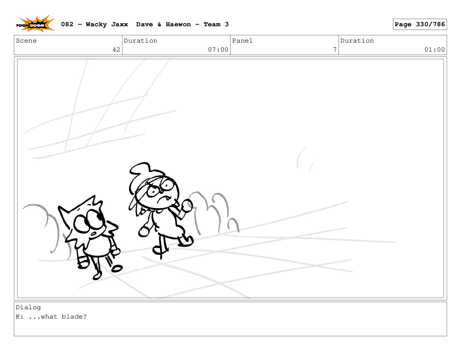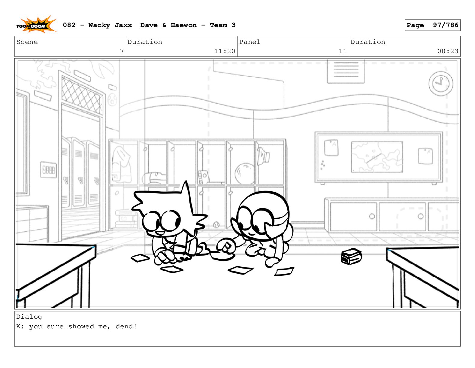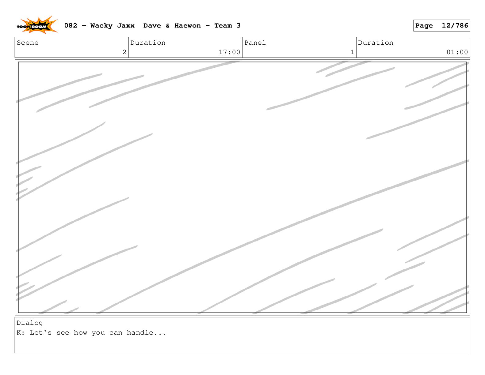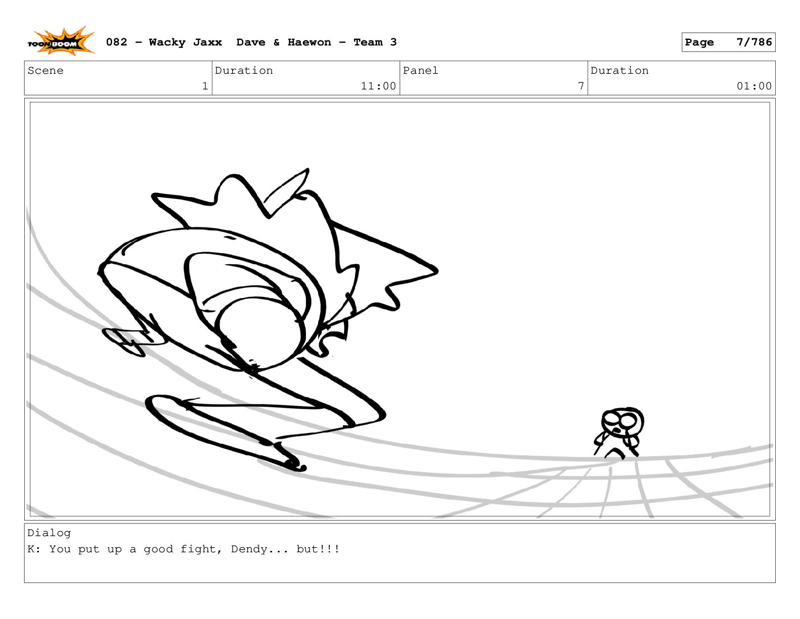 Scene 1 Duration 11:00 Panel 7 Duration 01:00 Dialog K: