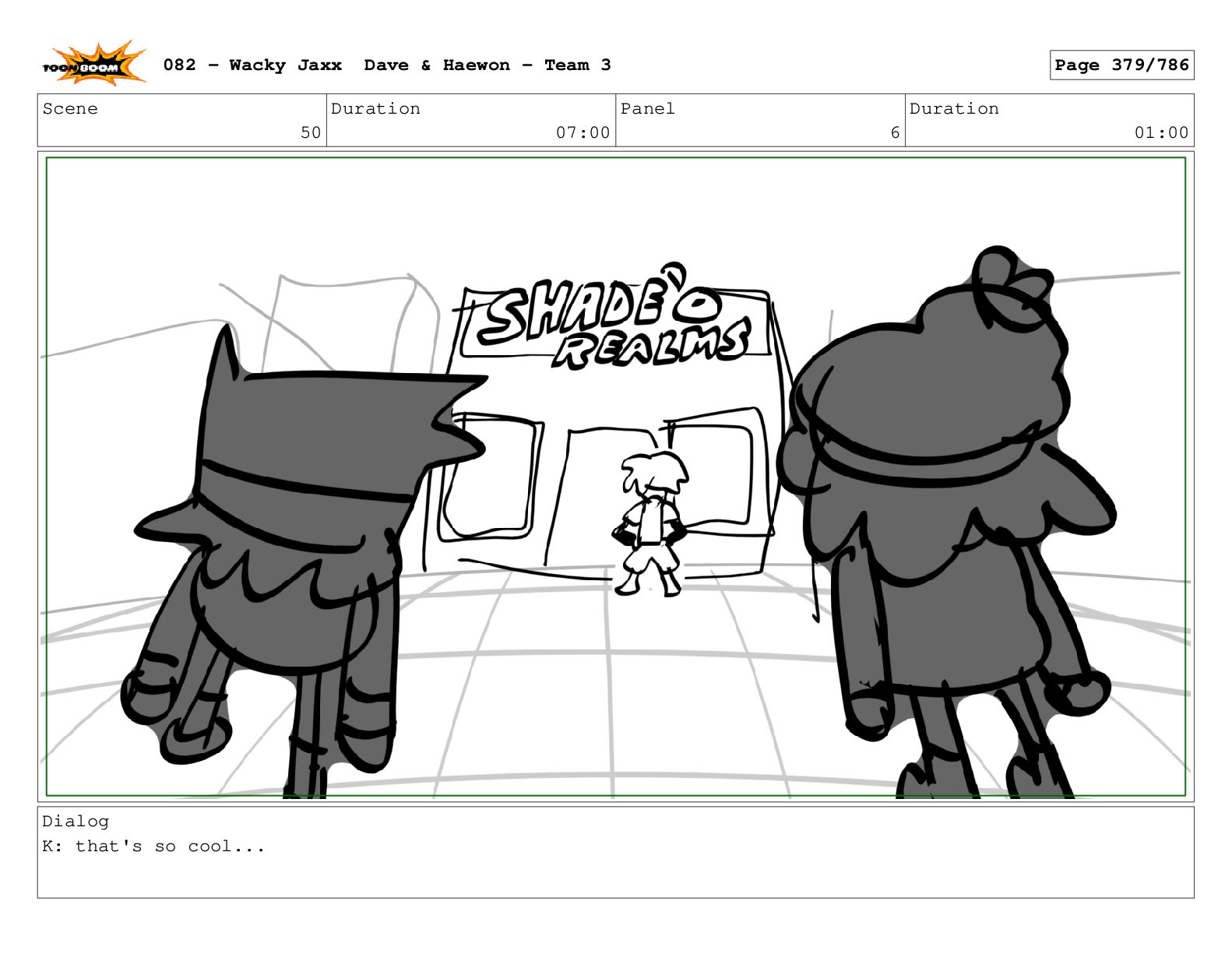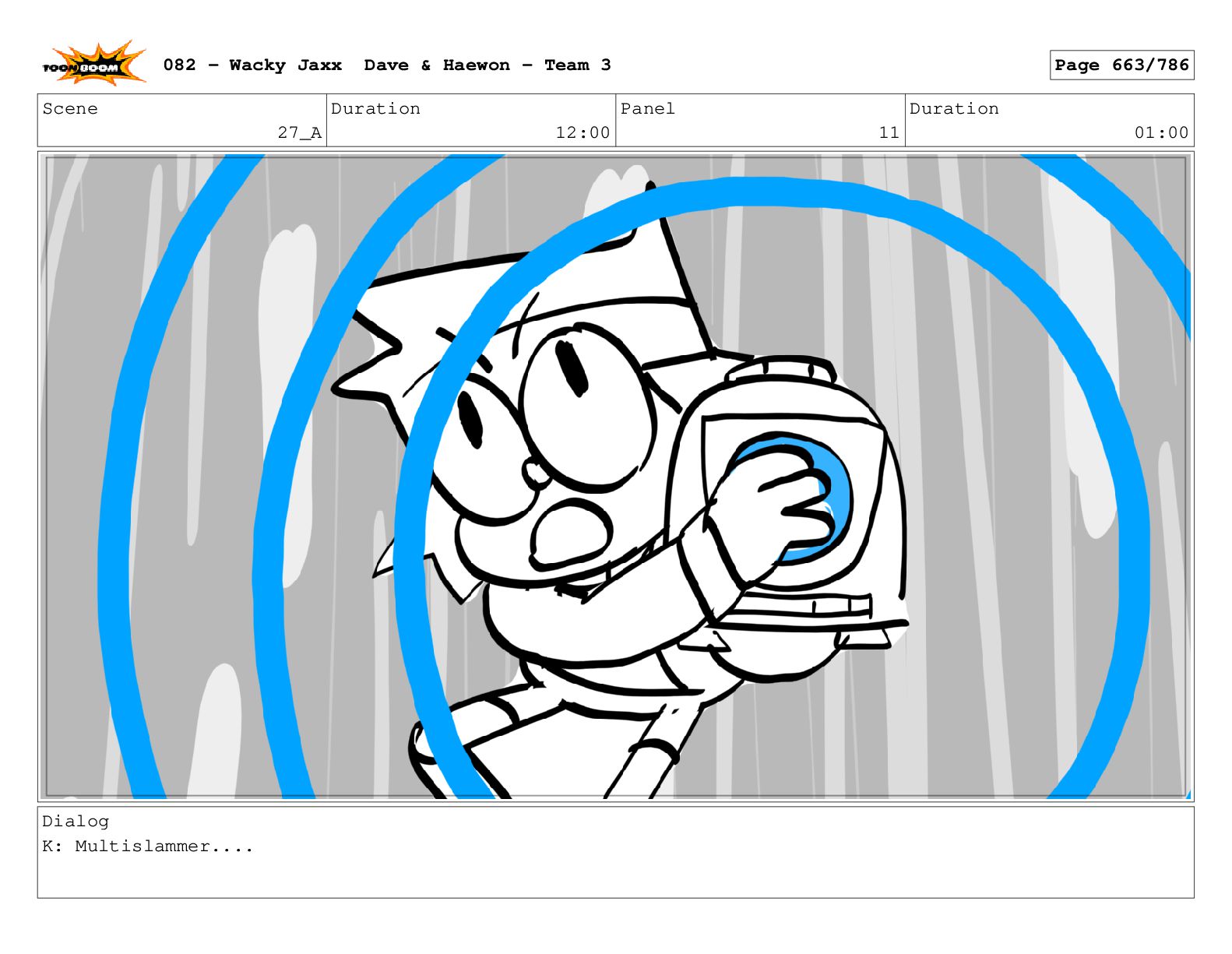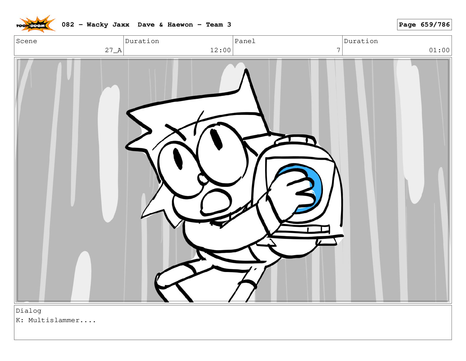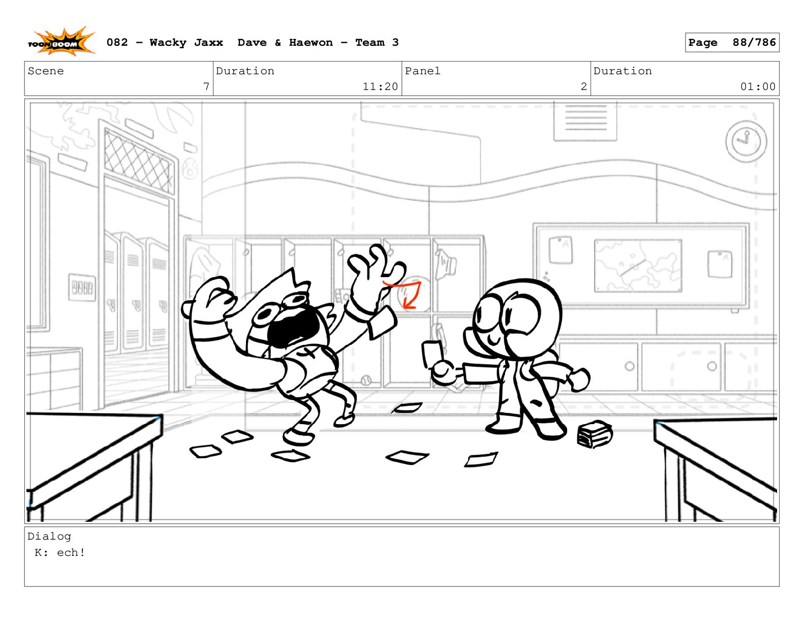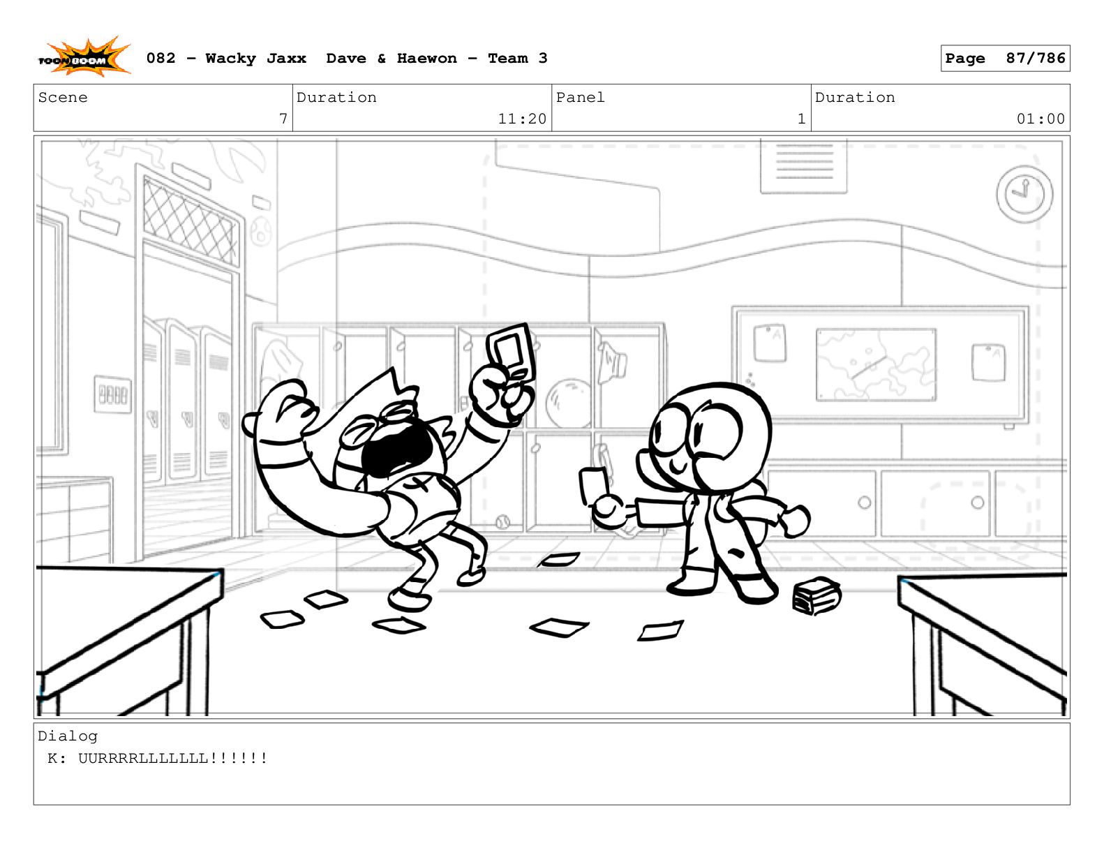 Scene 1 Duration 11:00 Panel 7 Duration 01:00 Dialog K: