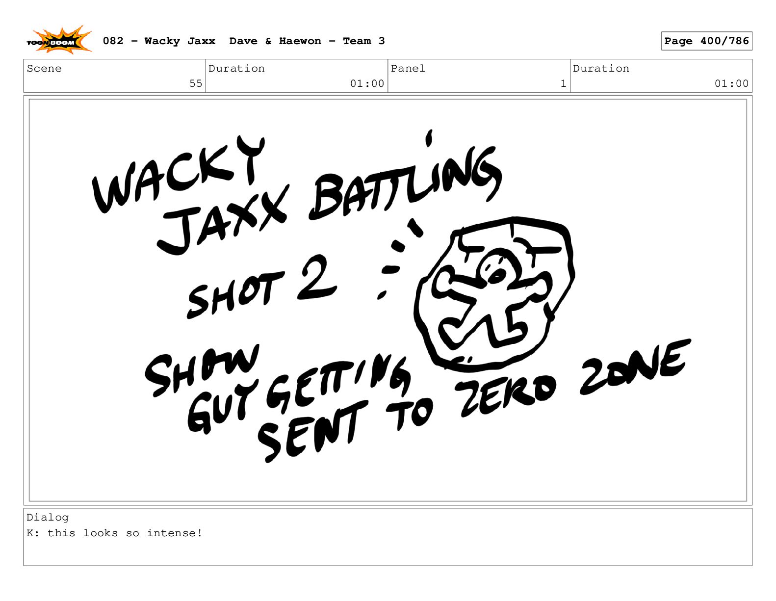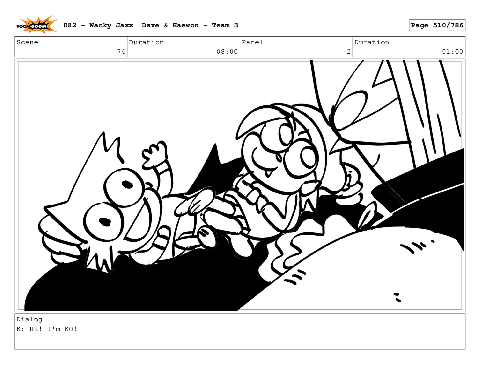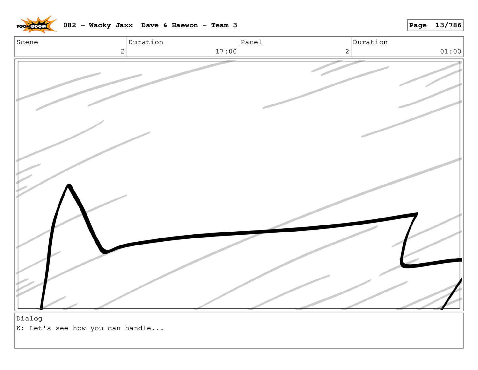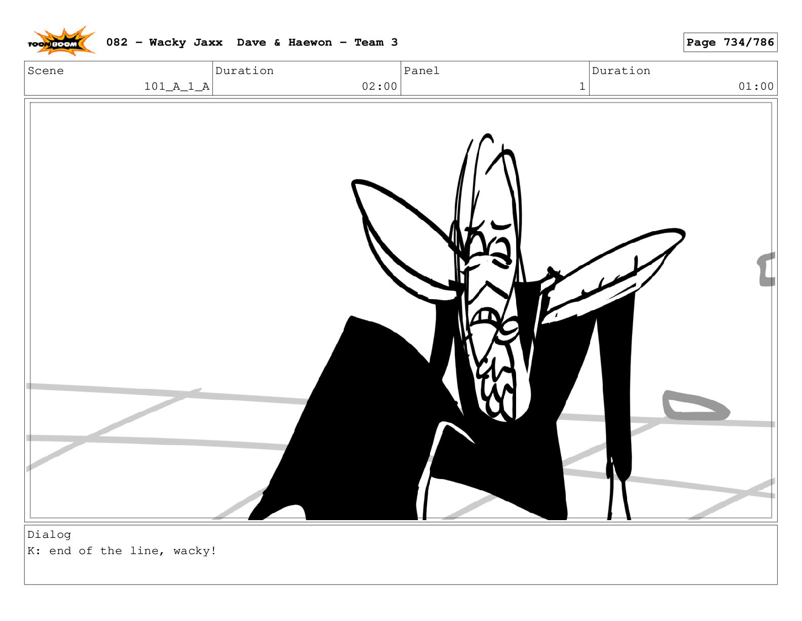 Scene 102 Duration 05:00 Panel 2 Duration 01:00 Dialog K:
