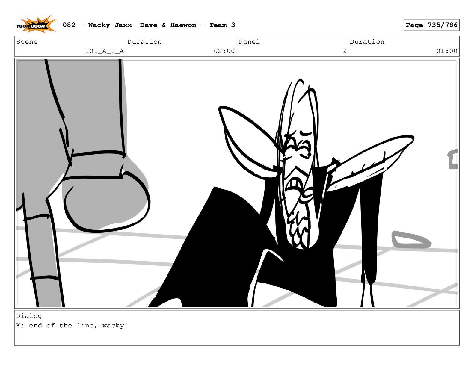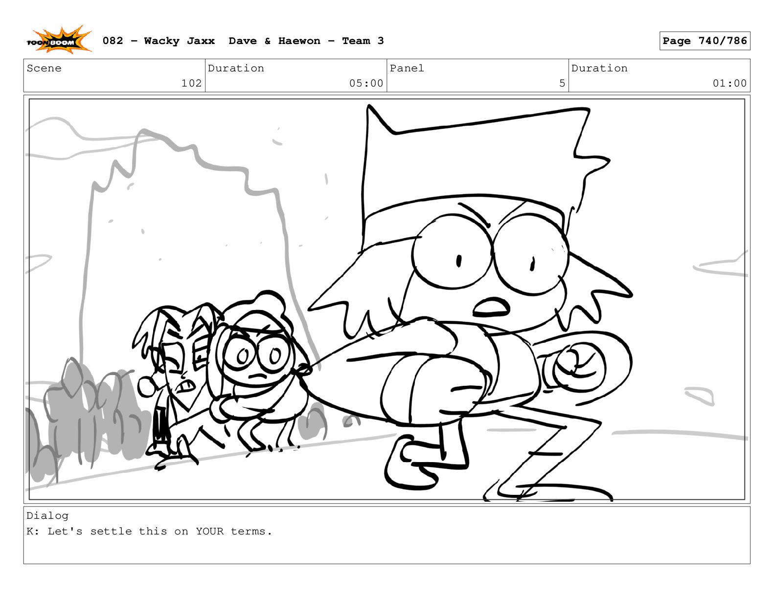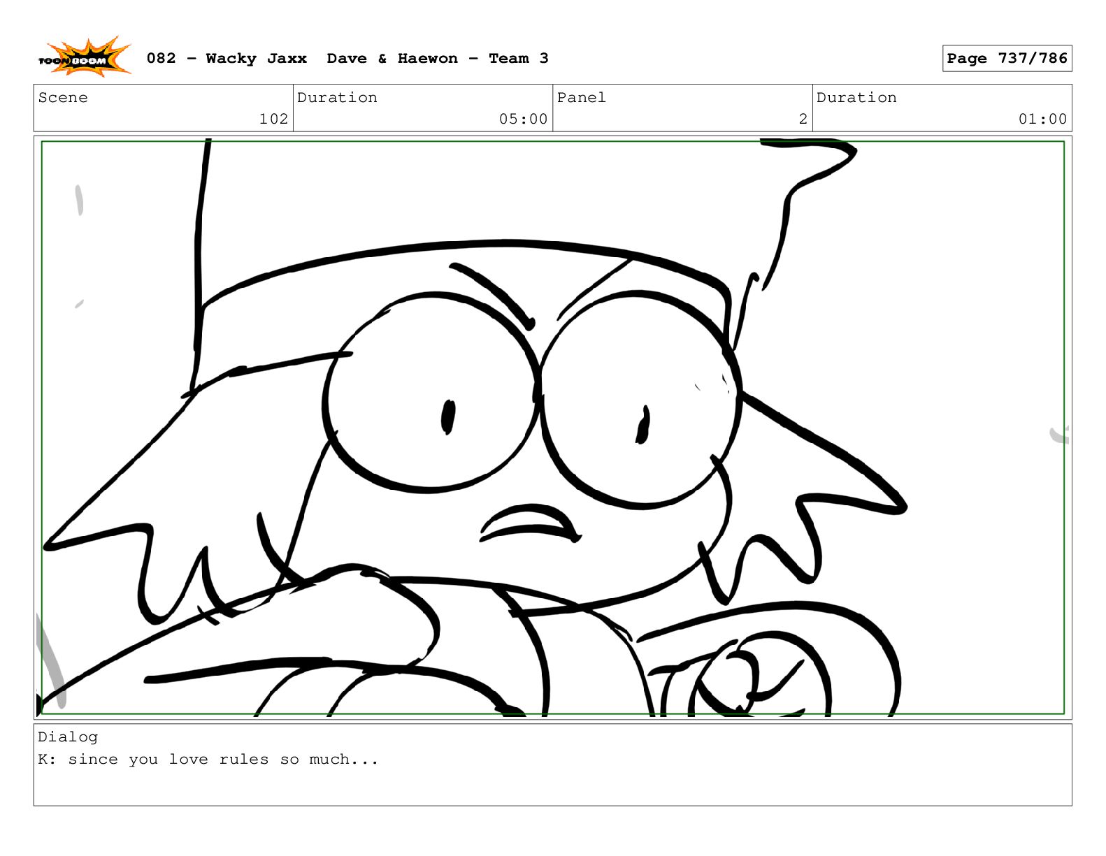 Scene 102 Duration 05:00 Panel 5 Duration 01:00 Dialog K: