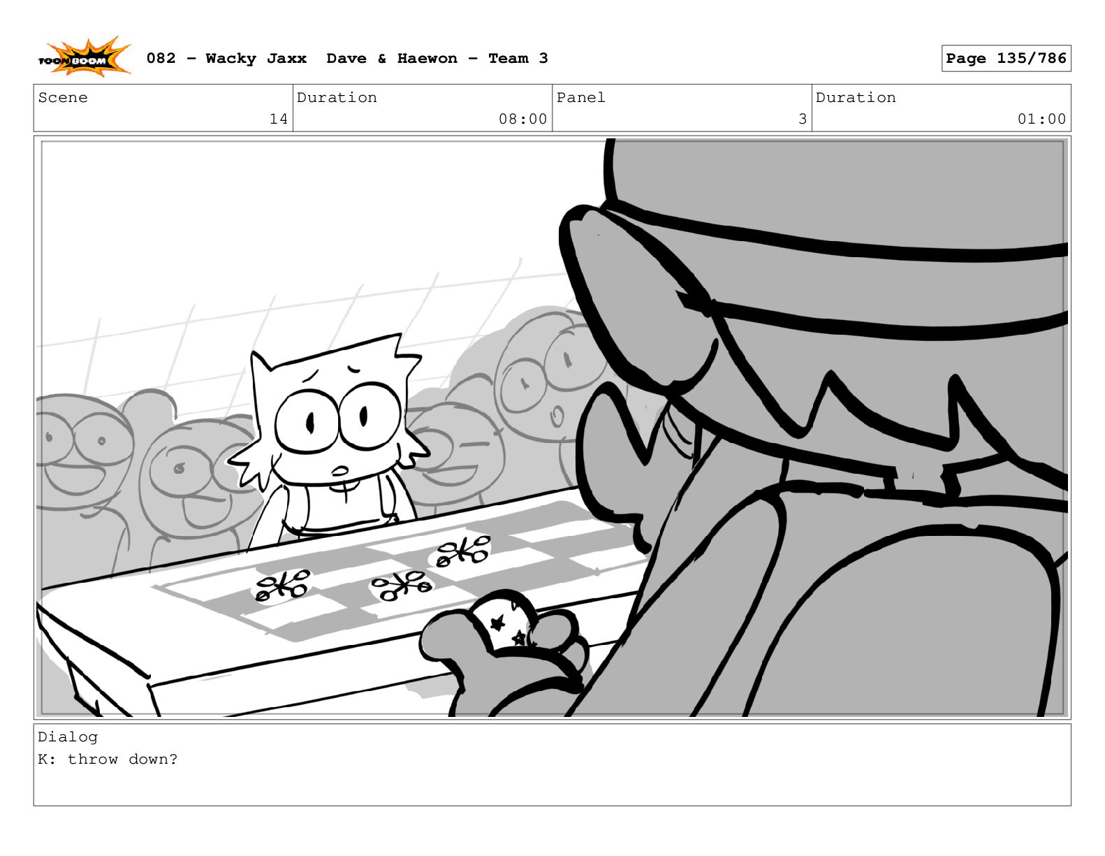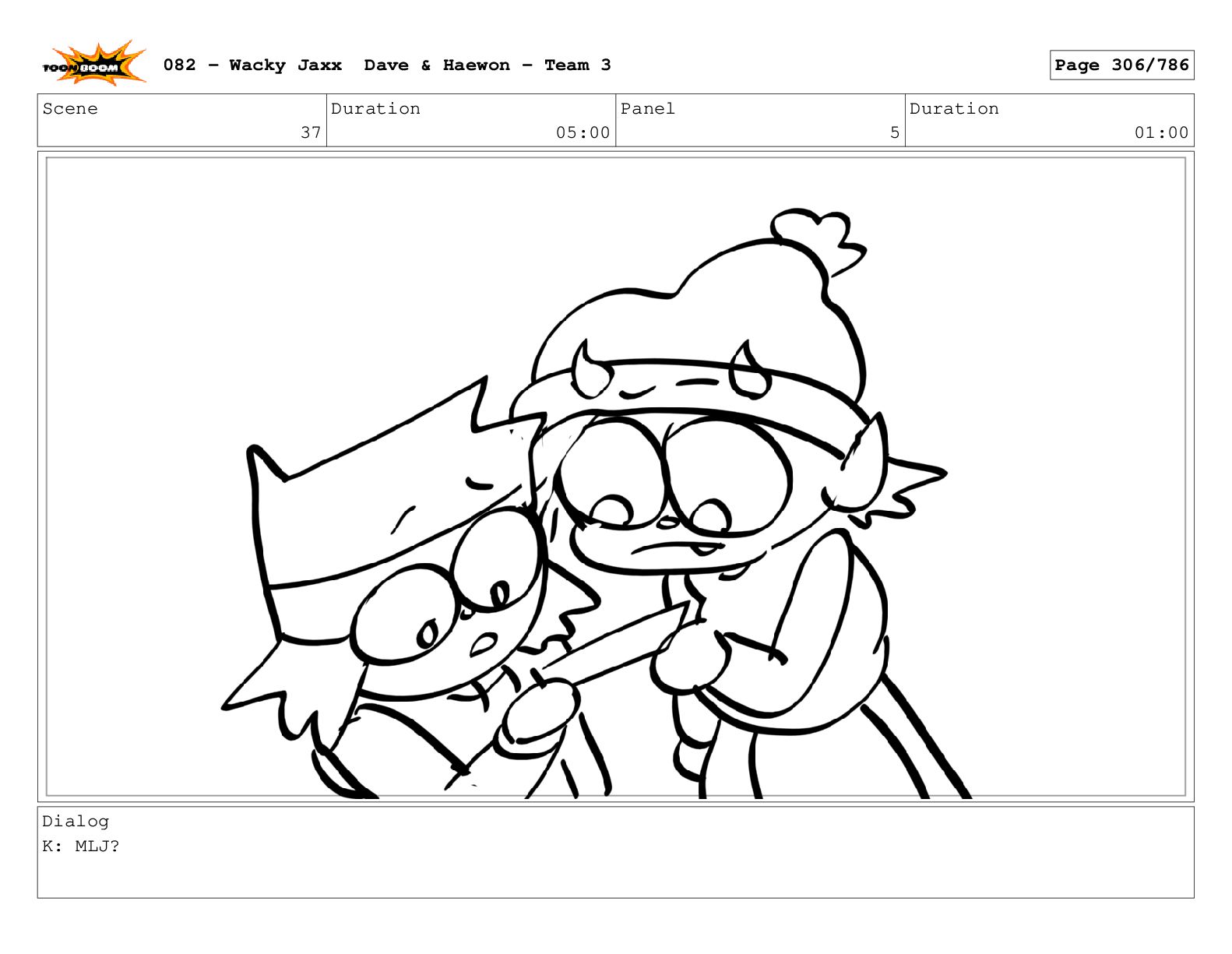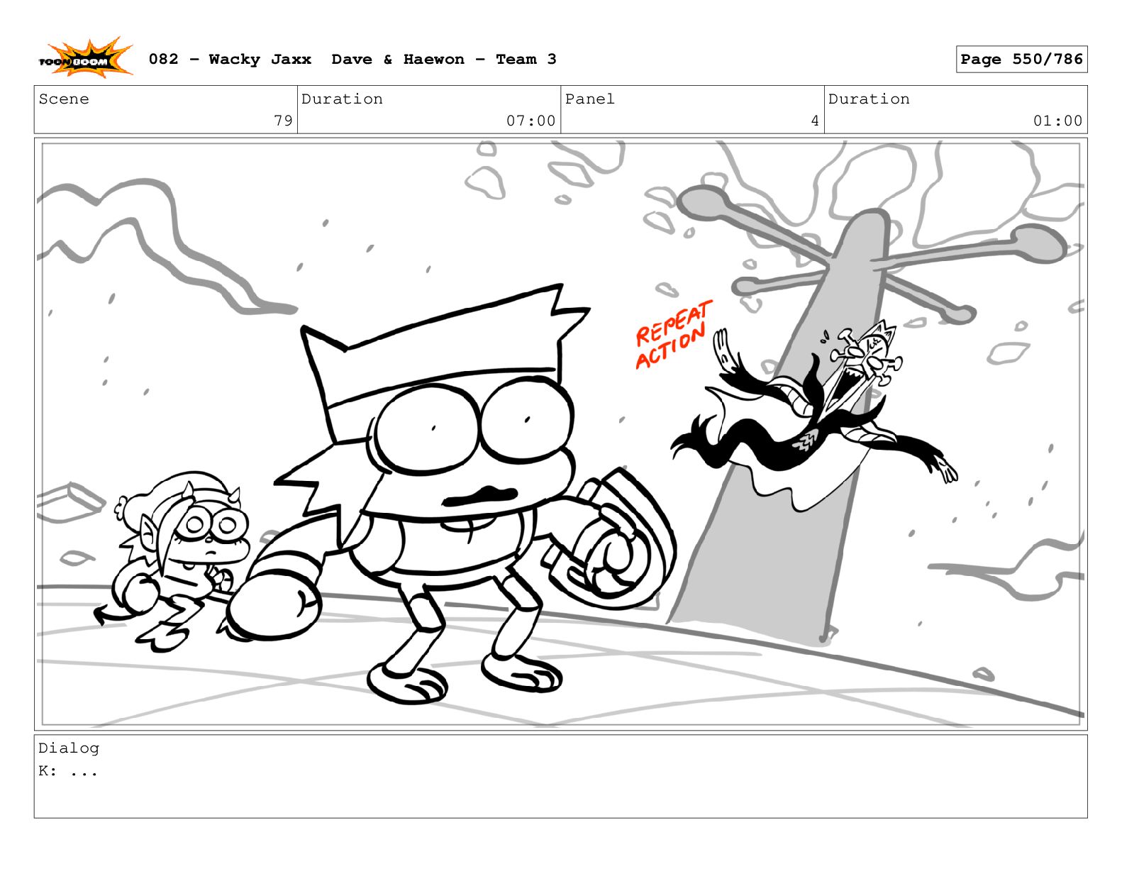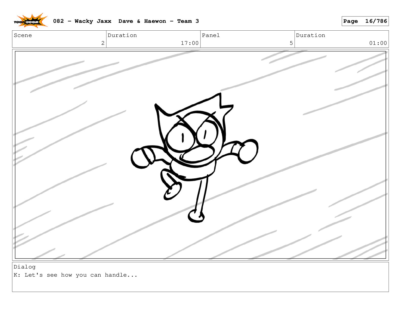 Scene 102 Duration 05:00 Panel 5 Duration 01:00 Dialog K: