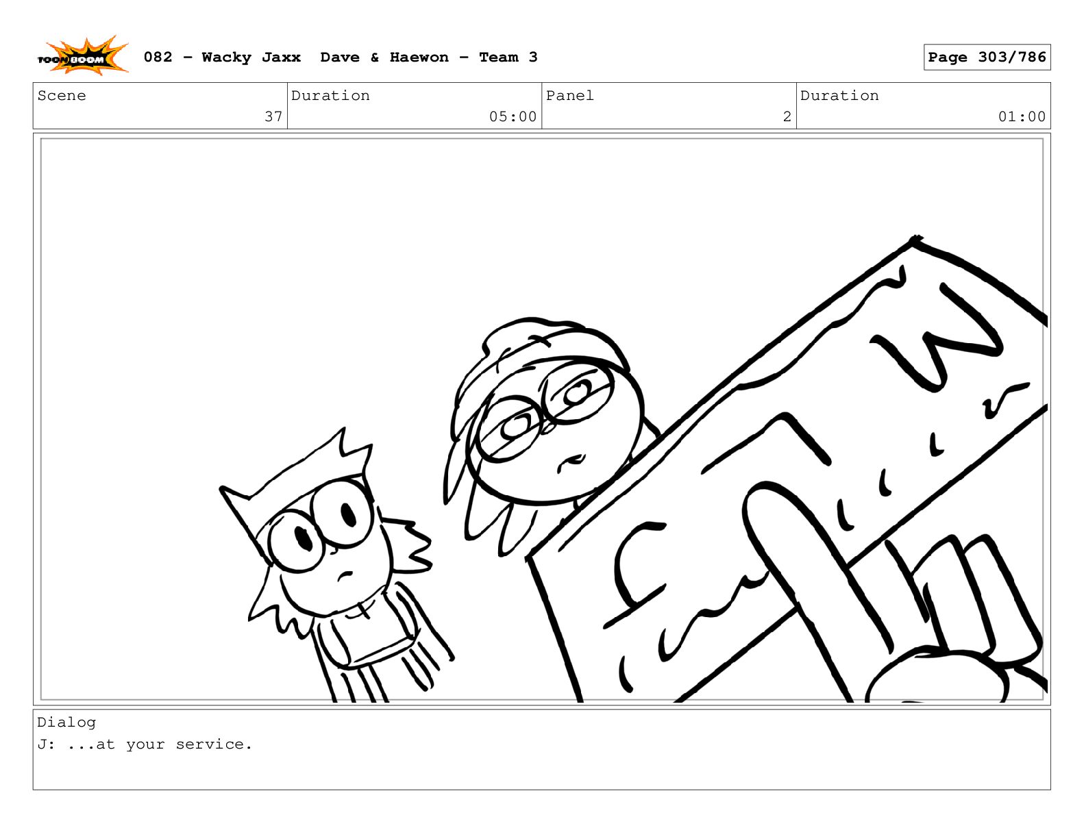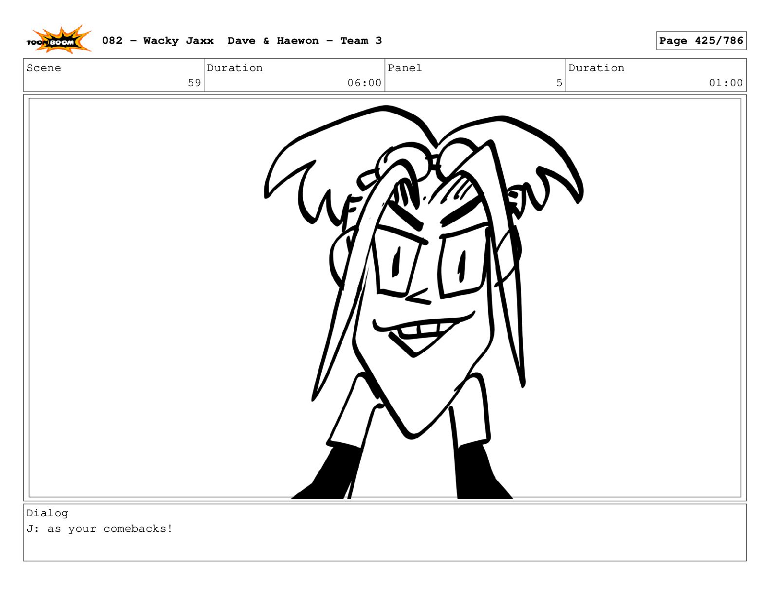 Scene 112 Duration 06:00 Panel 5 Duration 01:00 Dialog J: