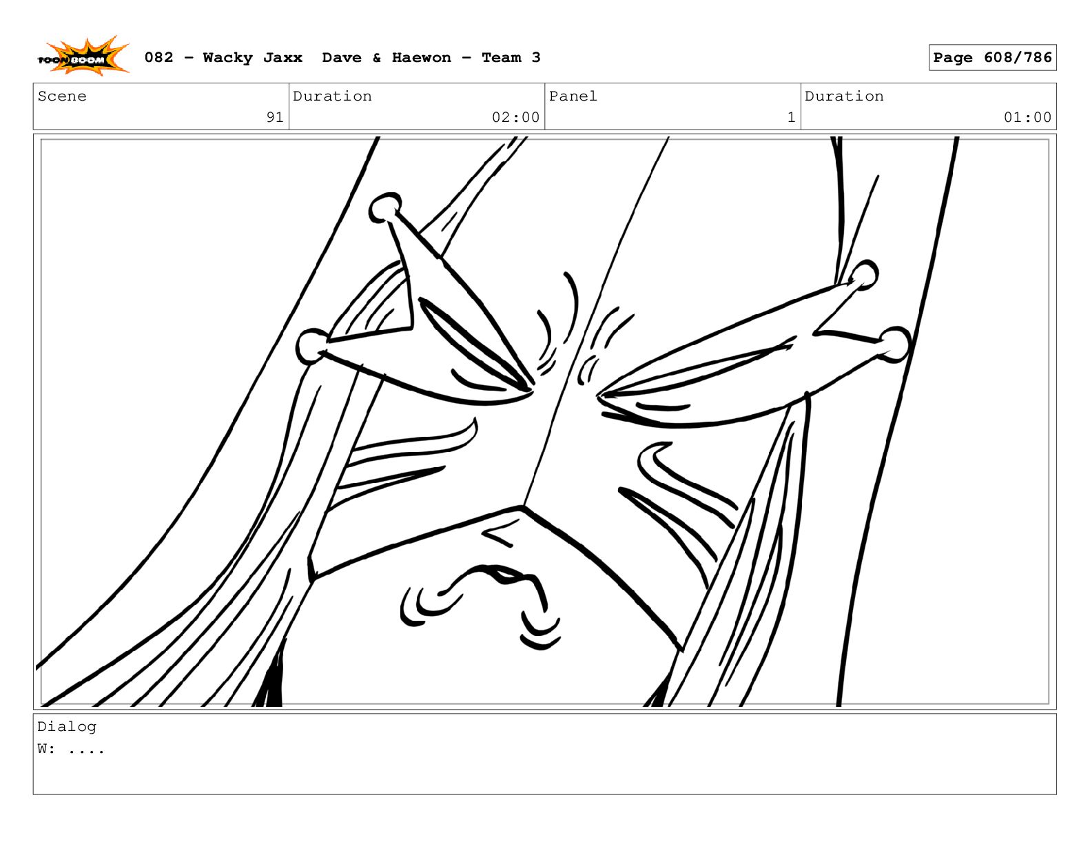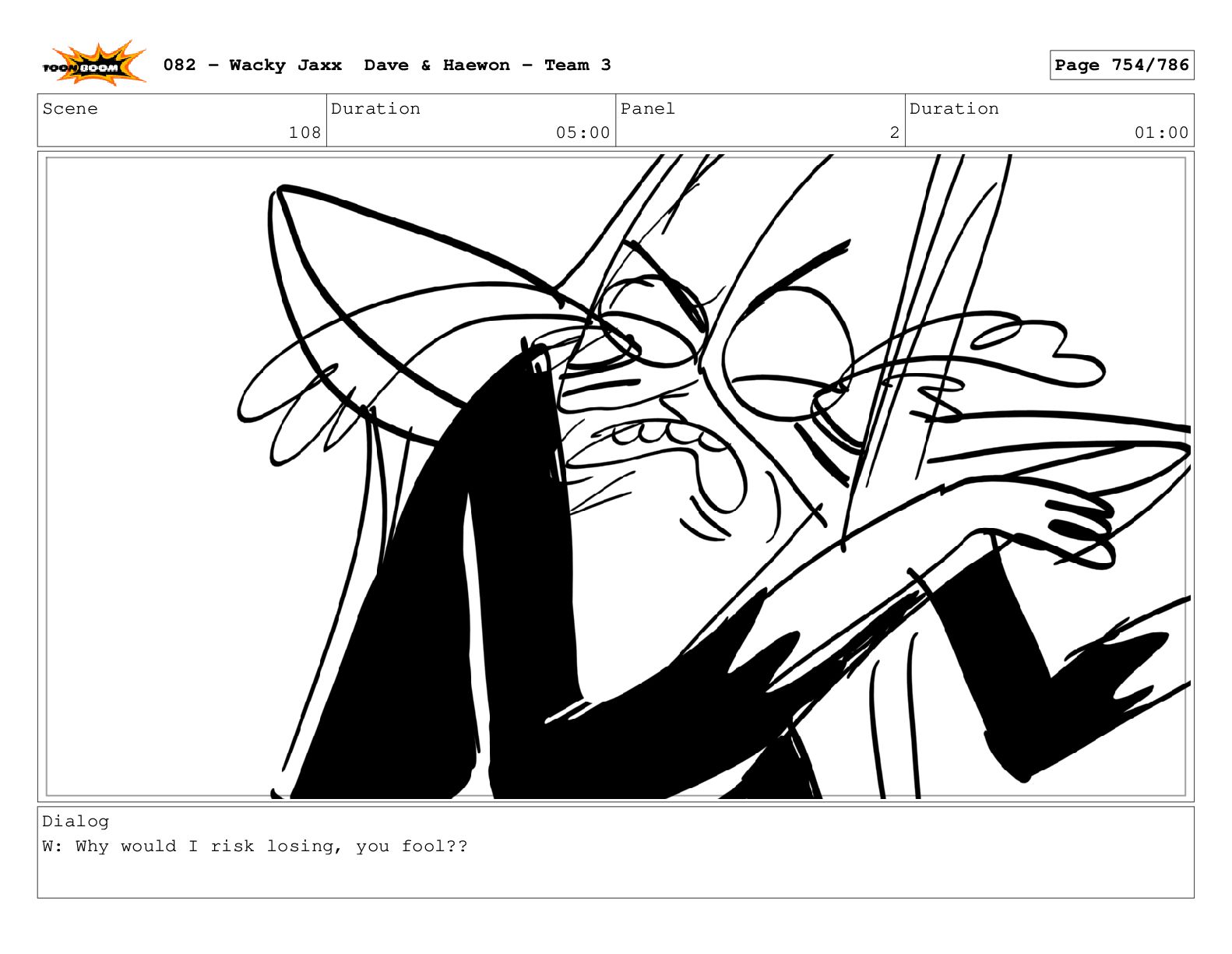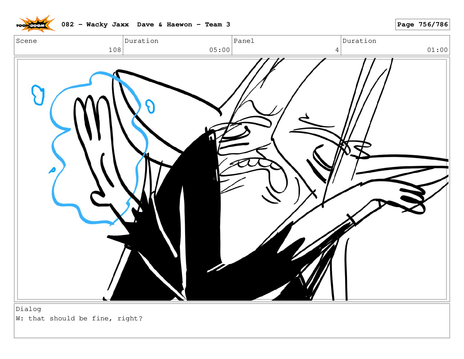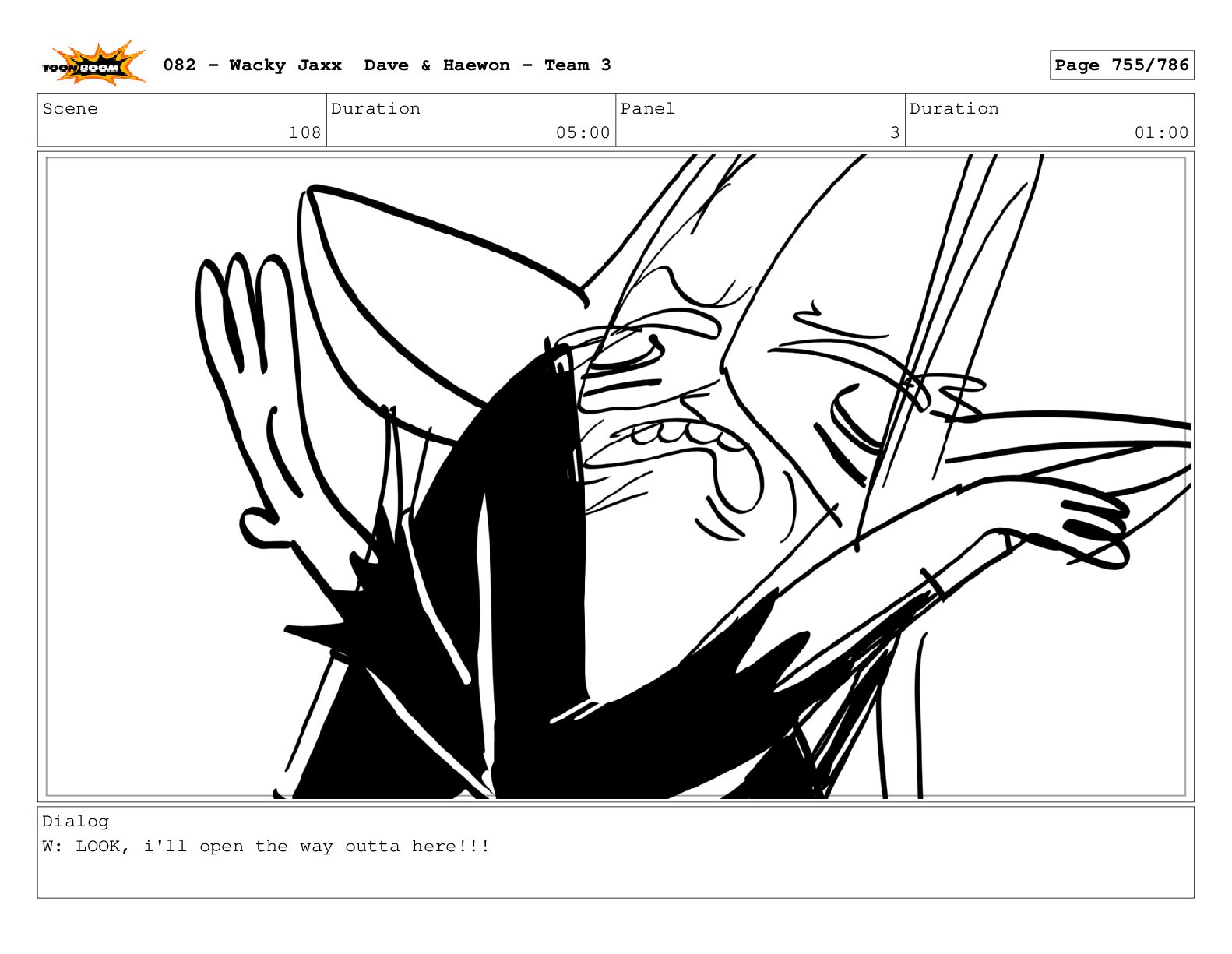Scene 108 Duration 05:00 Panel 5 Duration 01:00 Dialog W: