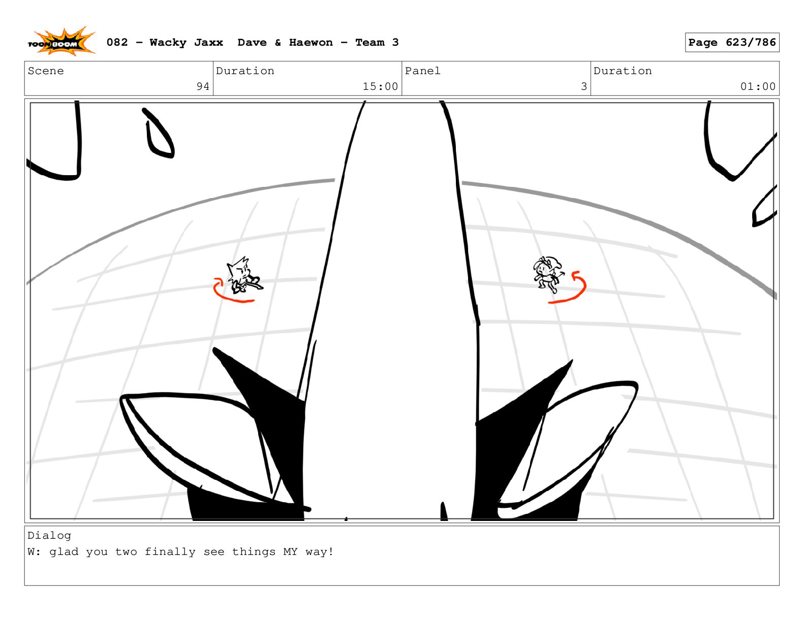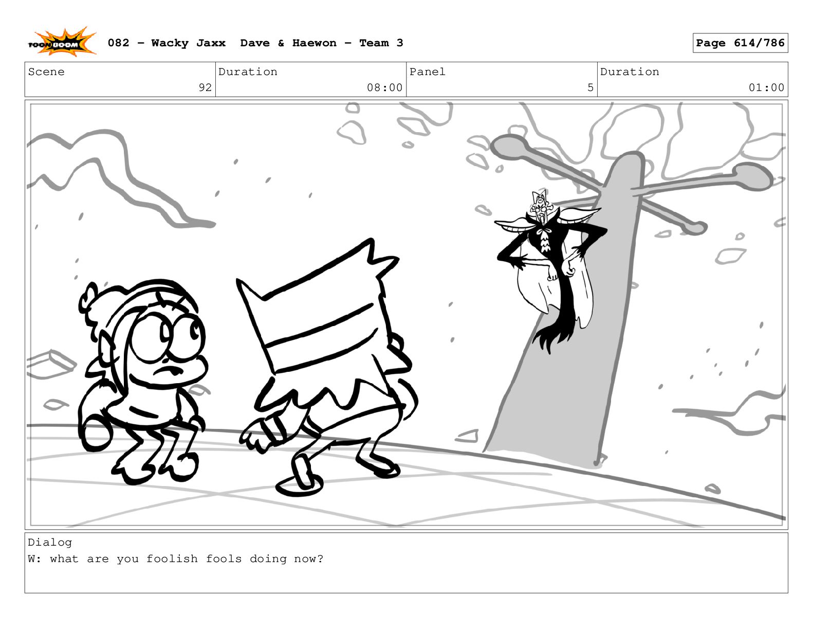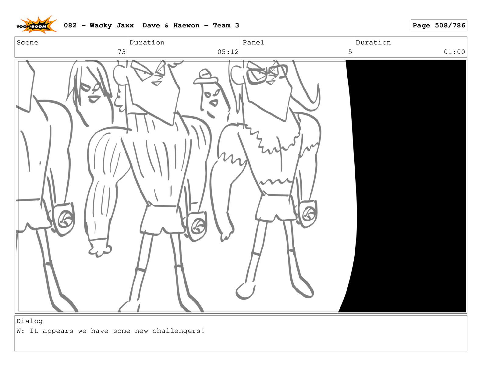 Scene 108 Duration 05:00 Panel 5 Duration 01:00 Dialog W: