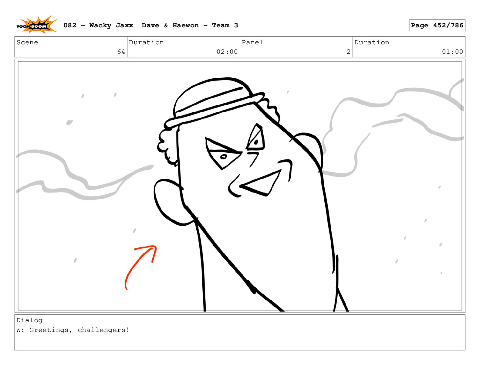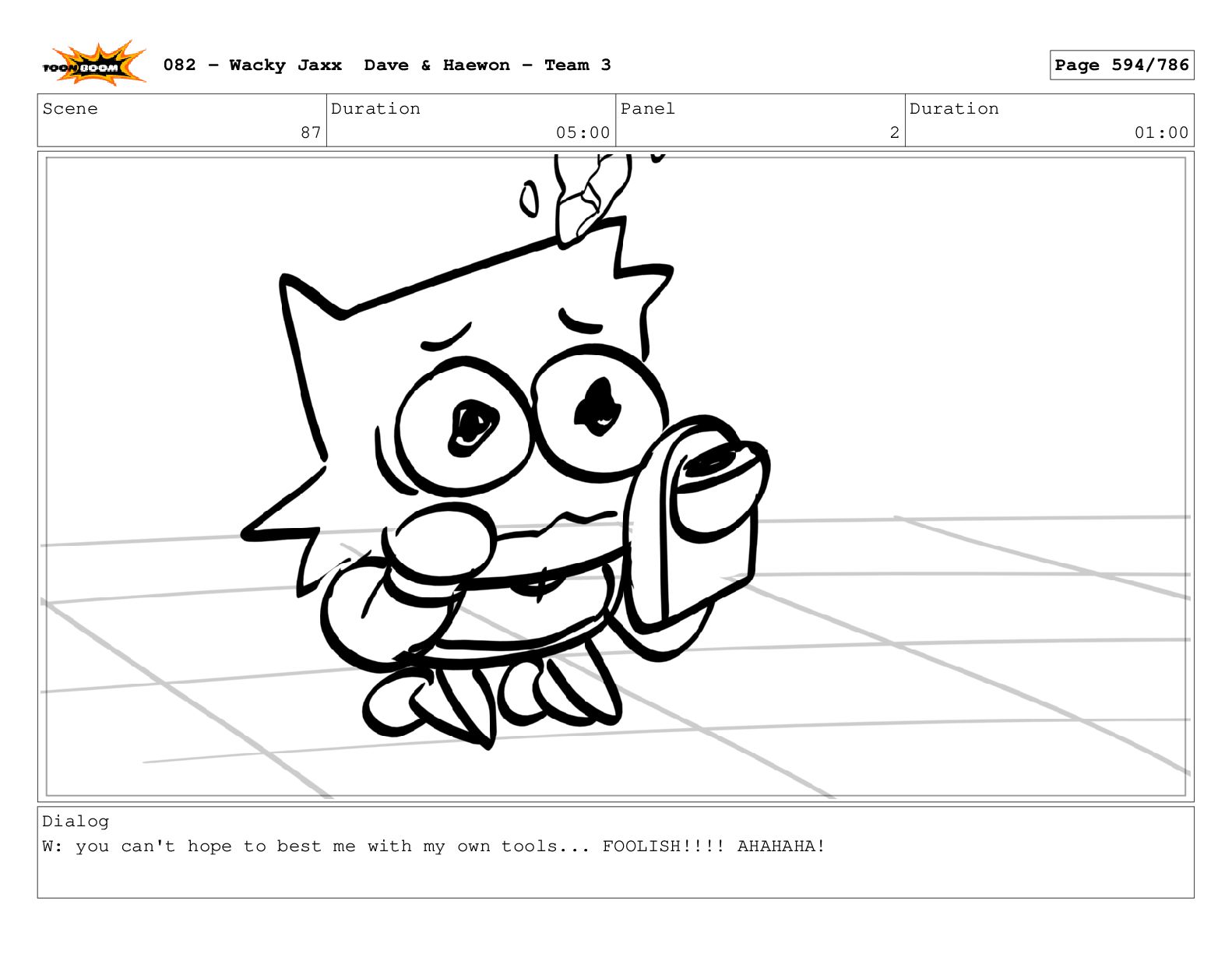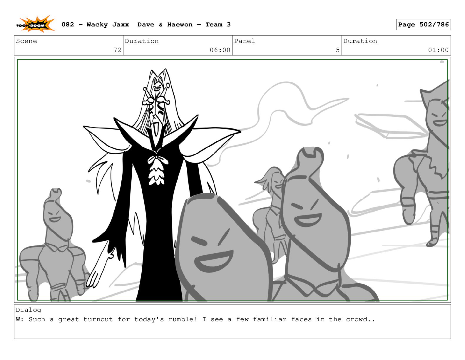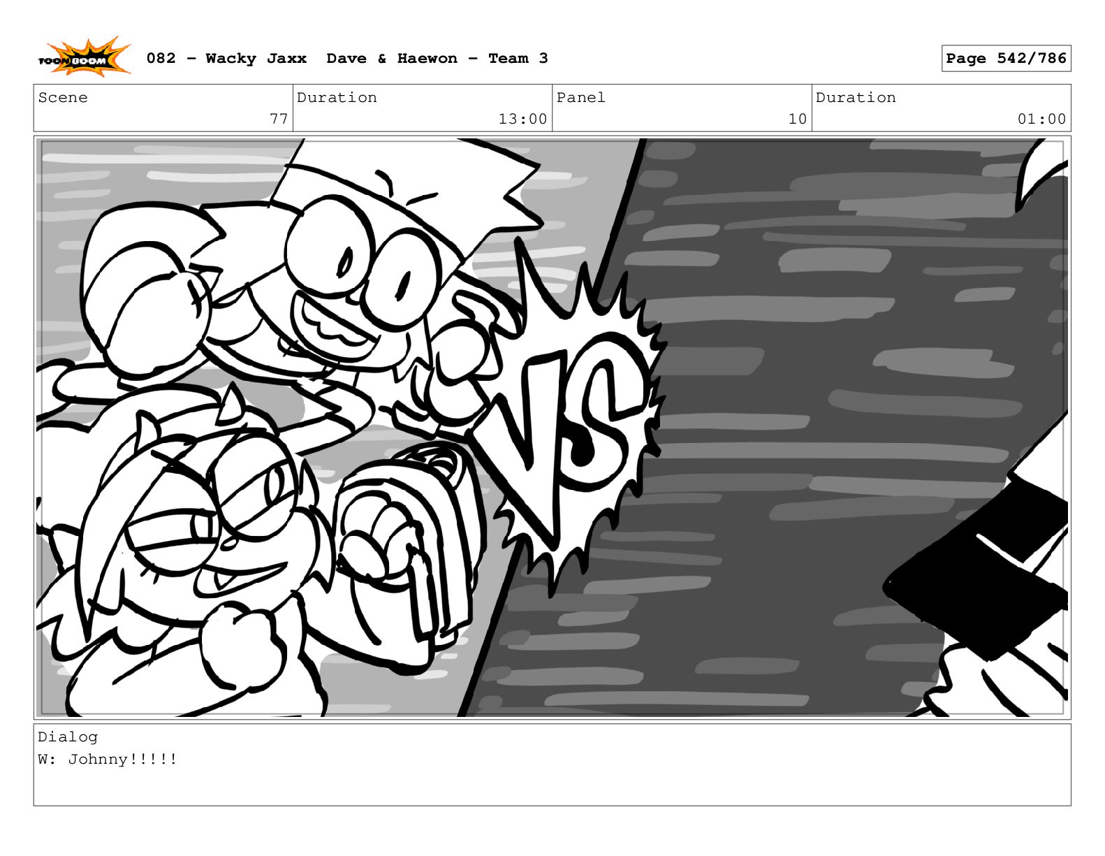 Scene 108 Duration 05:00 Panel 5 Duration 01:00 Dialog W: