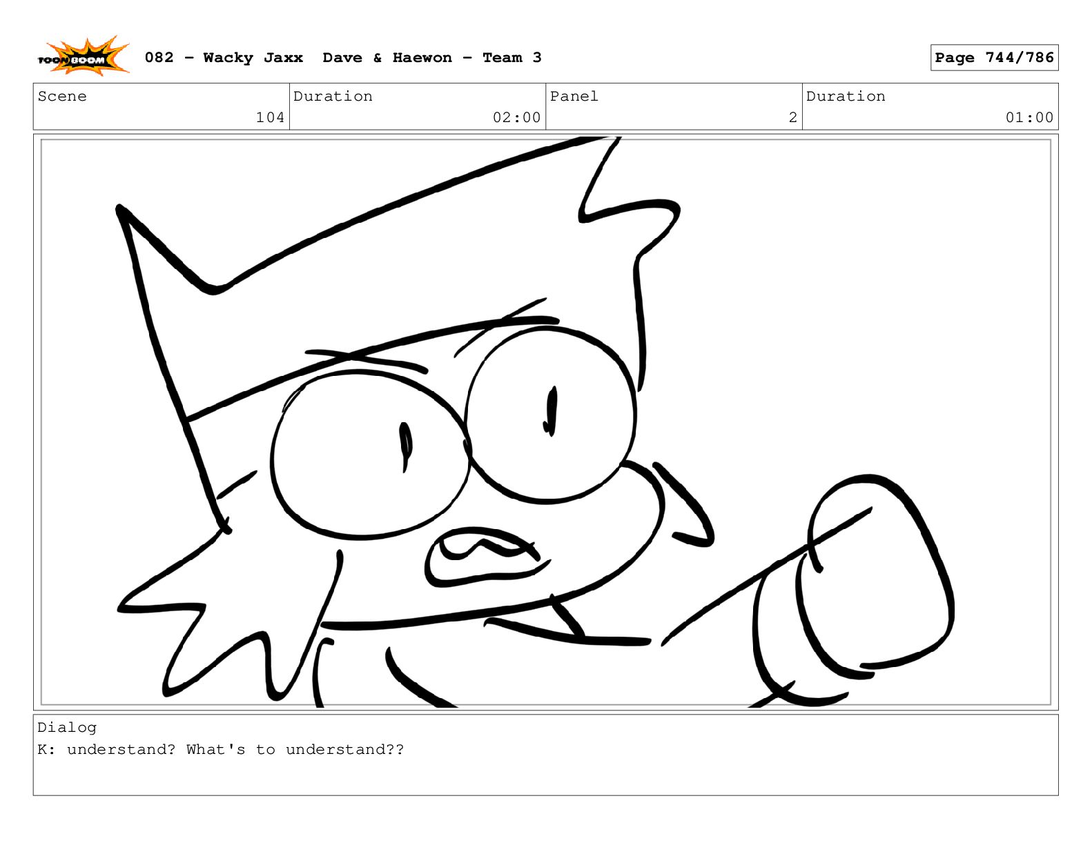 Scene 104 Duration 02:00 Panel 2 Duration 01:00 Dialog K: