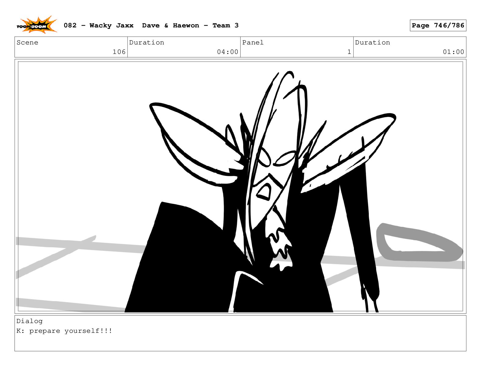 Scene 106 Duration 04:00 Panel 1 Duration 01:00 Dialog K: