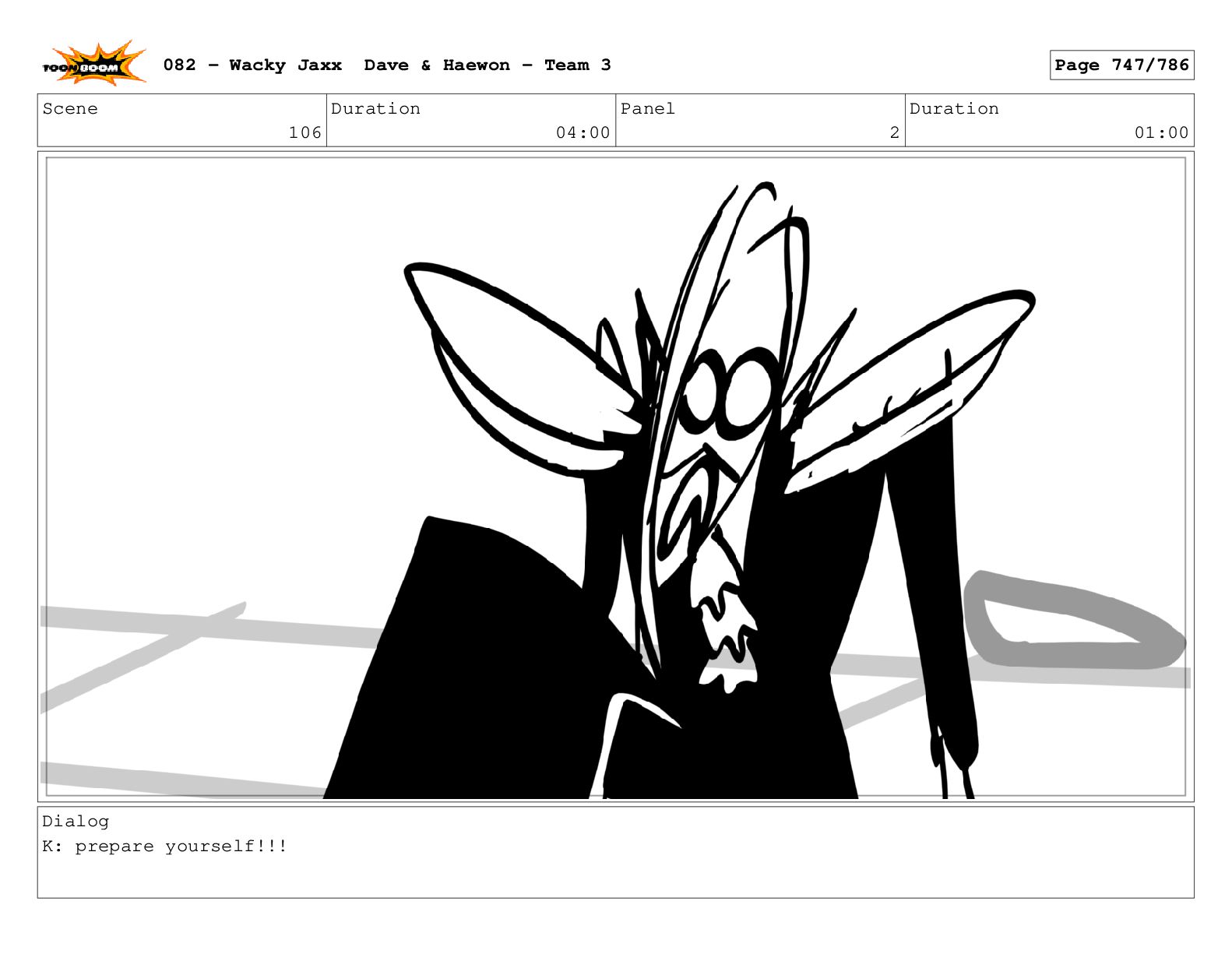 Scene 106 Duration 04:00 Panel 2 Duration 01:00 Dialog K:
