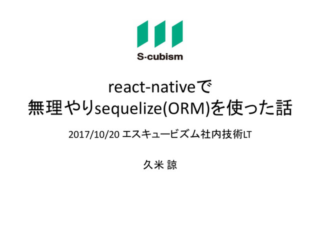 react-nativeで 無理やりsequelize(ORM)を使った話 2017/10/20 エスキュービズム社内技術LT 久米 諒