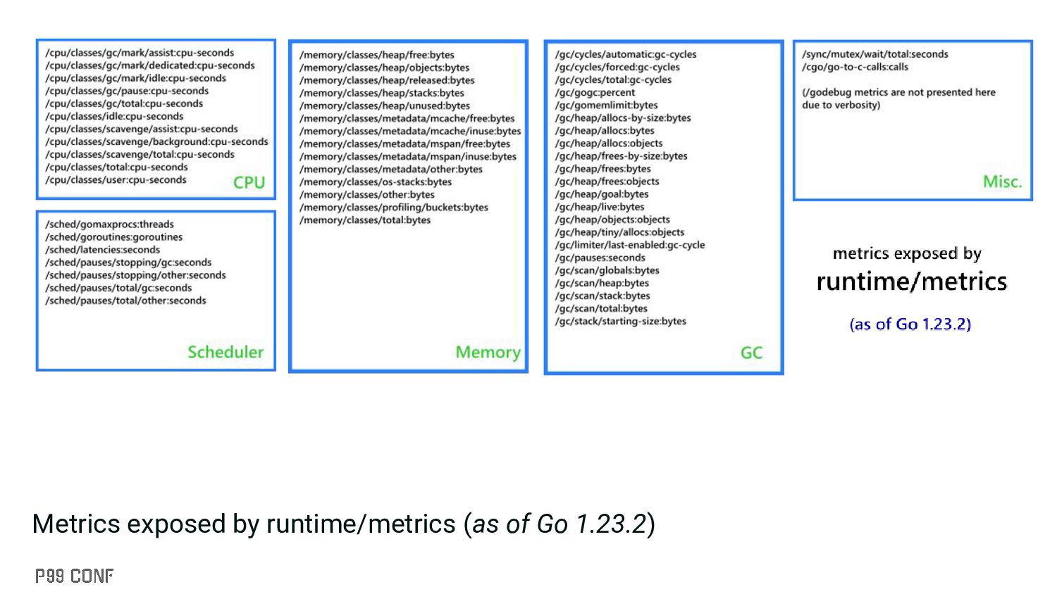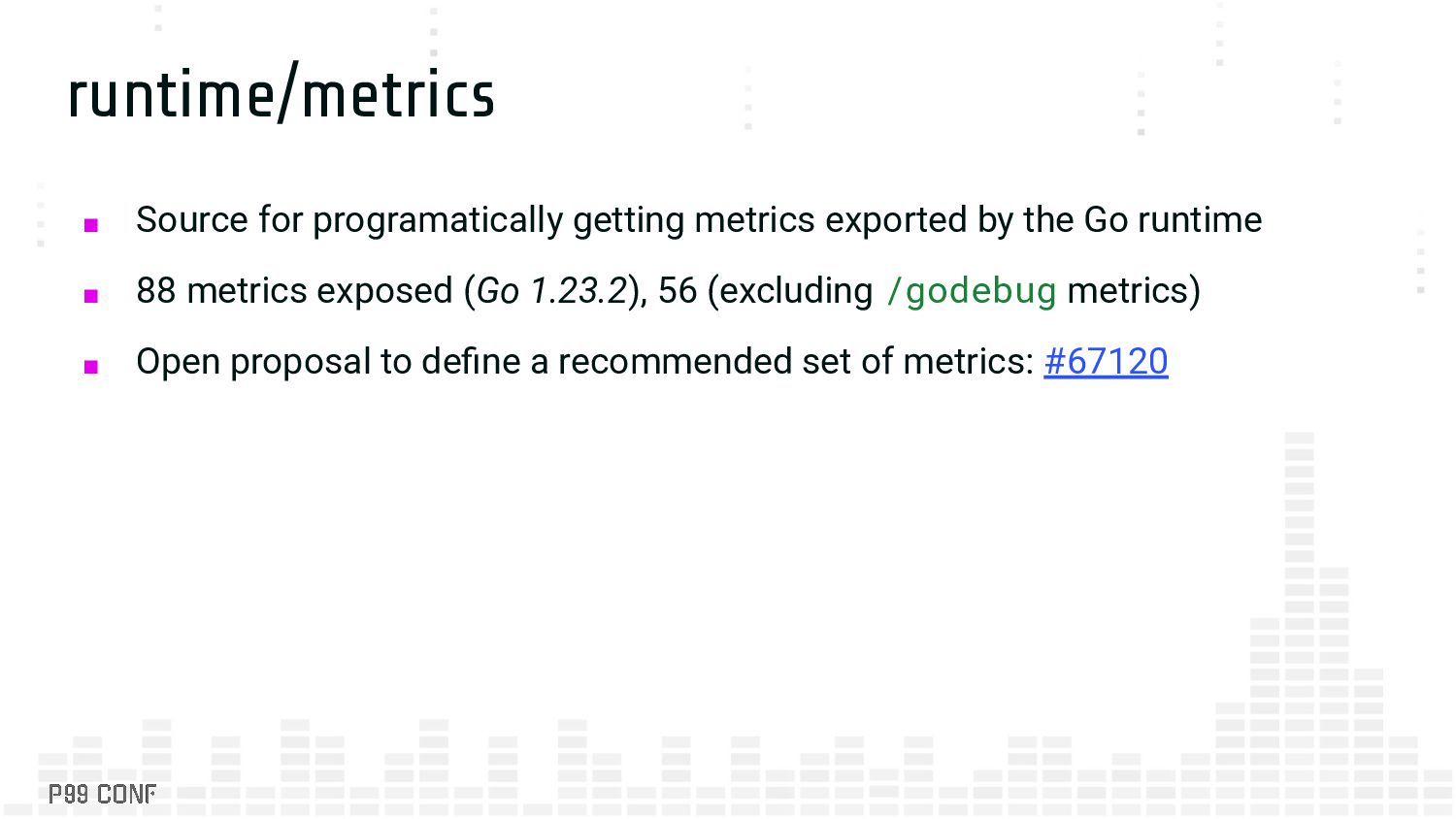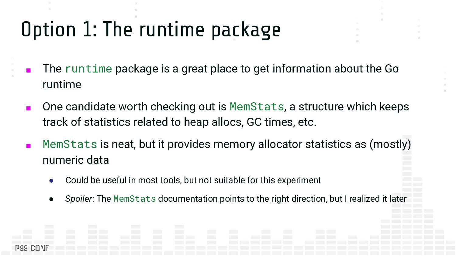 a great place to get information about the Go runtime ▪ One candidate worth checking out is MemStats, a structure which keeps track of statistics related to heap allocs, GC times, etc. ▪ MemStats is neat, but it provides memory allocator statistics as (mostly) numeric data • Could be useful in most tools, but not suitable for this experiment • Spoiler: The MemStats documentation points to the right direction, but I realized it later