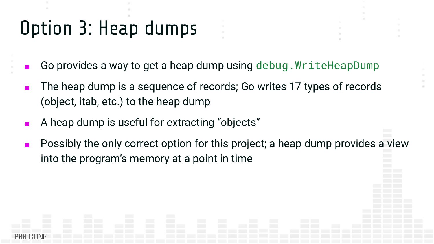 get a heap dump using debug.WriteHeapDump ▪ The heap dump is a sequence of records; Go writes 17 types of records (object, itab, etc.) to the heap dump ▪ A heap dump is useful for extracting “objects” ▪ Possibly the only correct option for this project; a heap dump provides a view into the program’s memory at a point in time