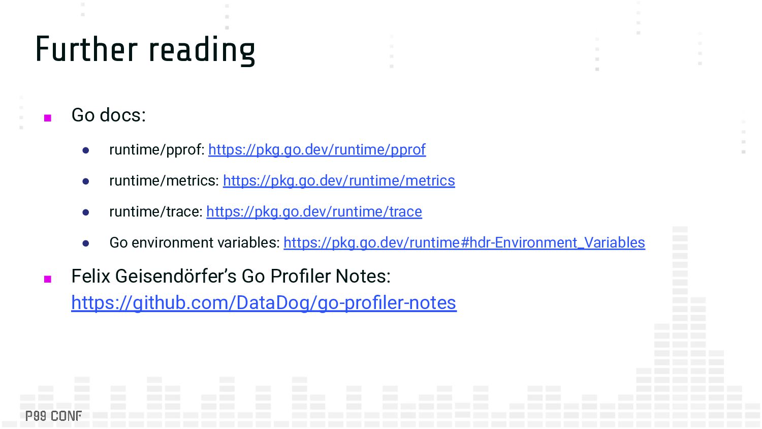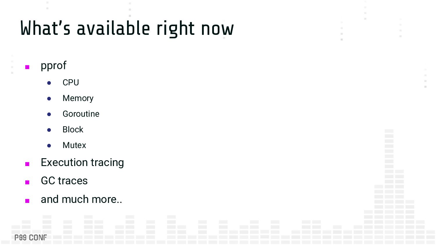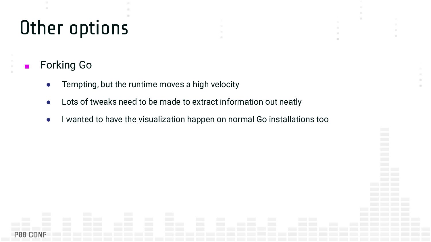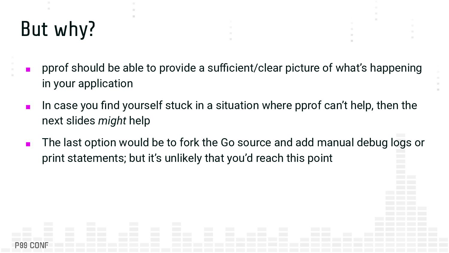 sufficient/clear picture of what’s happening in your application ▪ In case you find yourself stuck in a situation where pprof can’t help, then the next slides might help ▪ The last option would be to fork the Go source and add manual debug logs or print statements; but it’s unlikely that you’d reach this point