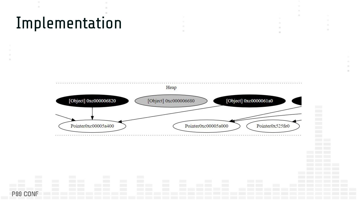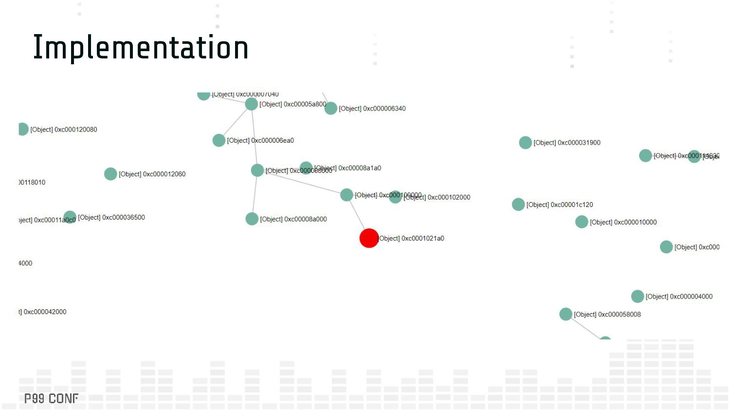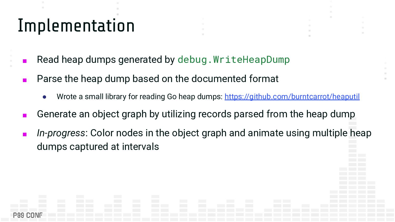 the heap dump based on the documented format • Wrote a small library for reading Go heap dumps: https://github.com/burntcarrot/heaputil ▪ Generate an object graph by utilizing records parsed from the heap dump ▪ In-progress: Color nodes in the object graph and animate using multiple heap dumps captured at intervals