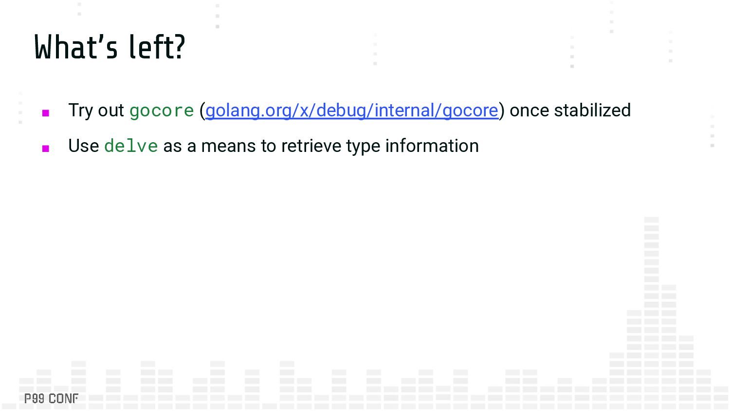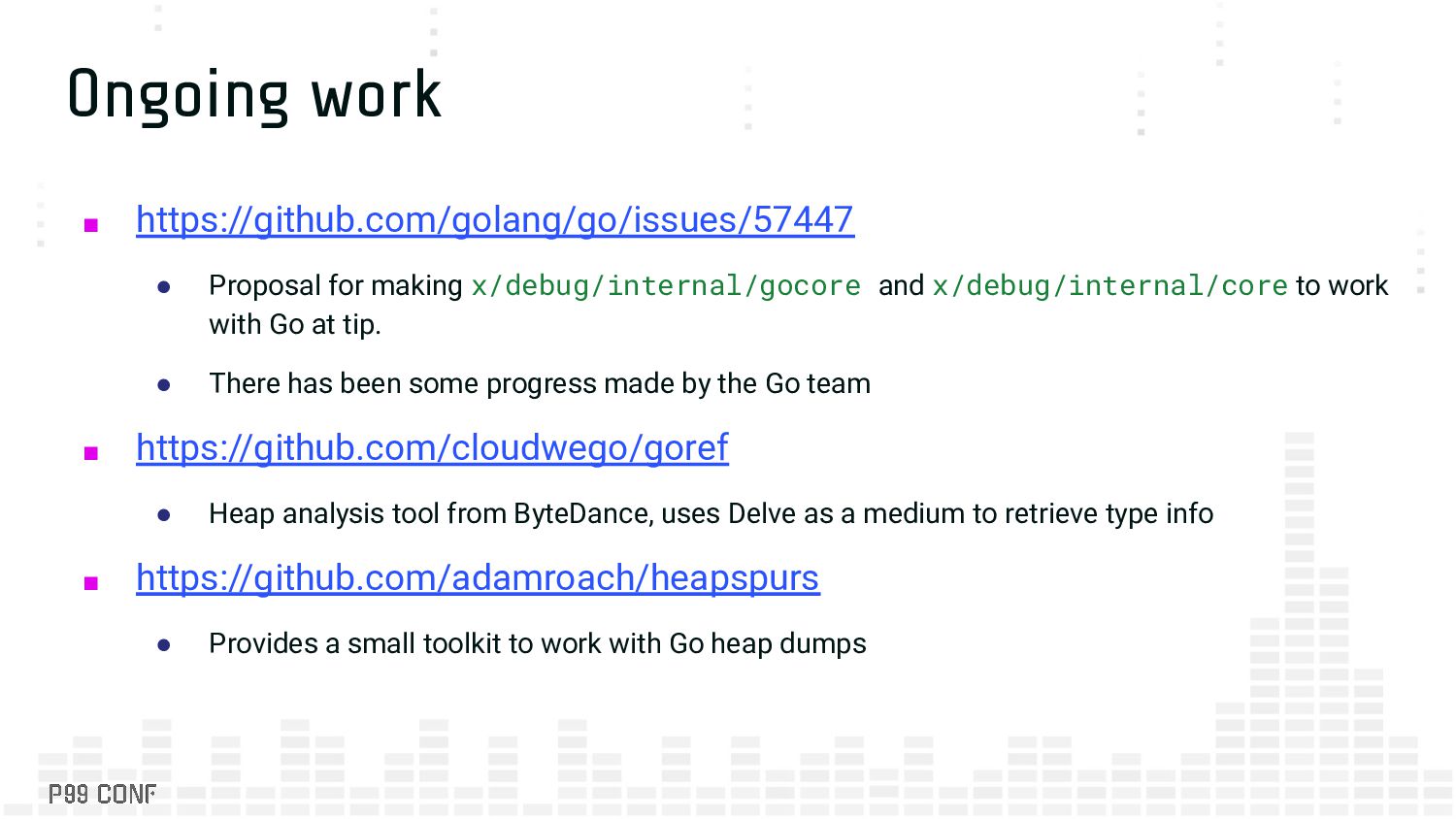 x/debug/internal/core to work with Go at tip. • There has been some progress made by the Go team ▪ https://github.com/cloudwego/goref • Heap analysis tool from ByteDance, uses Delve as a medium to retrieve type info ▪ https://github.com/adamroach/heapspurs • Provides a small toolkit to work with Go heap dumps