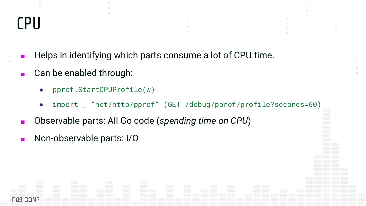 of CPU time. ▪ Can be enabled through: • pprof.StartCPUProfile(w) • import _ "net/http/pprof" (GET /debug/pprof/profile?seconds=60) ▪ Observable parts: All Go code (spending time on CPU) ▪ Non-observable parts: I/O