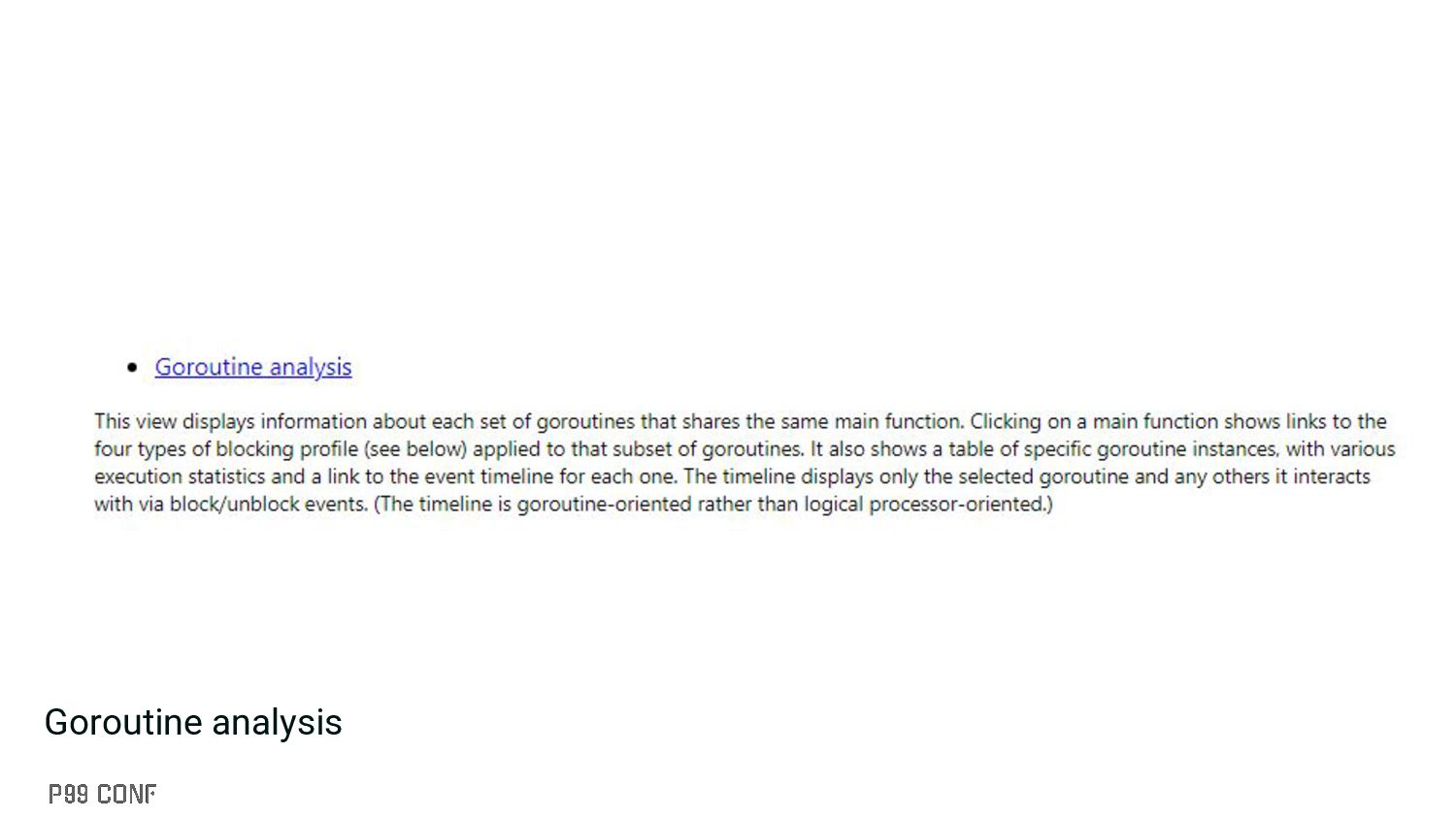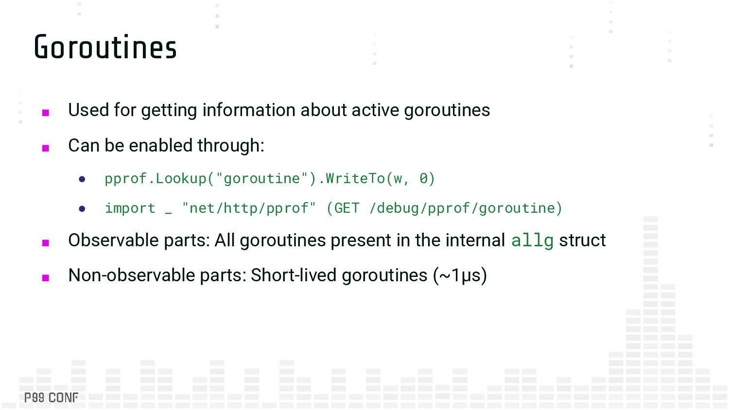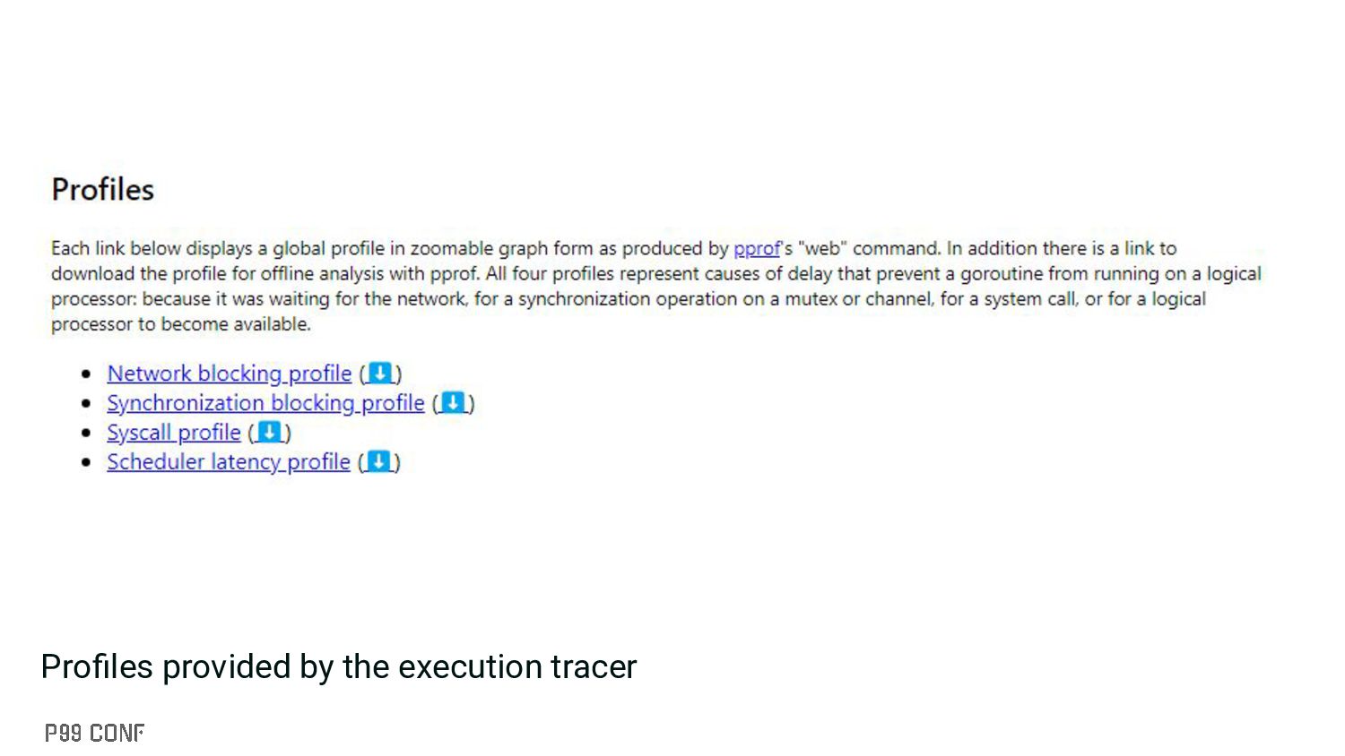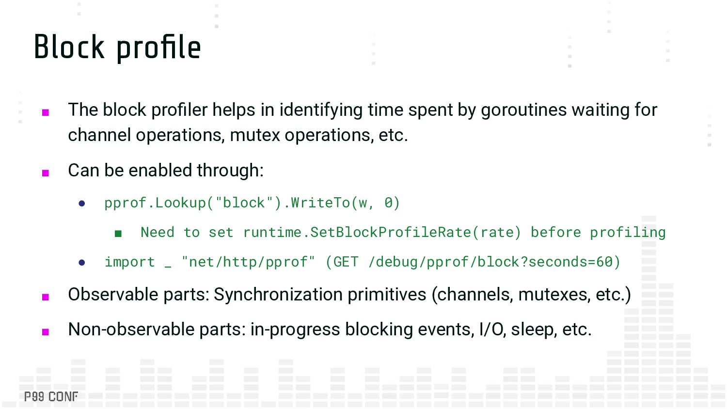 spent by goroutines waiting for channel operations, mutex operations, etc. ▪ Can be enabled through: • pprof.Lookup("block").WriteTo(w, 0) ▪ Need to set runtime.SetBlockProfileRate(rate) before profiling • import _ "net/http/pprof" (GET /debug/pprof/block?seconds=60) ▪ Observable parts: Synchronization primitives (channels, mutexes, etc.) ▪ Non-observable parts: in-progress blocking events, I/O, sleep, etc.