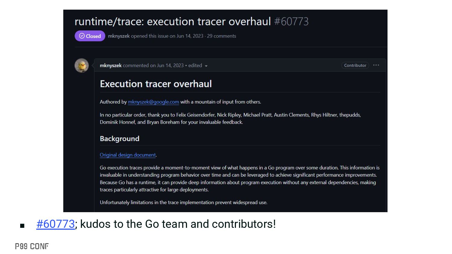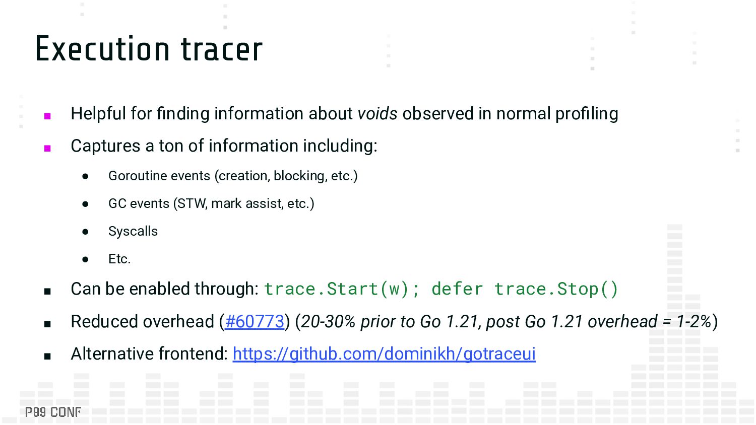 in normal profiling ▪ Captures a ton of information including: • Goroutine events (creation, blocking, etc.) • GC events (STW, mark assist, etc.) • Syscalls • Etc. ▪ Can be enabled through: trace.Start(w); defer trace.Stop() ▪ Reduced overhead (#60773) (20-30% prior to Go 1.21, post Go 1.21 overhead = 1-2%) ▪ Alternative frontend: https://github.com/dominikh/gotraceui