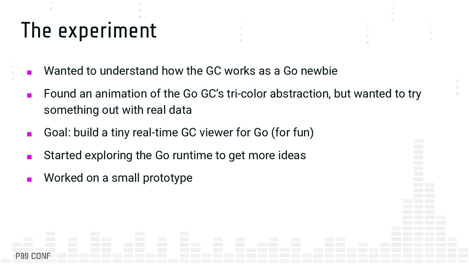 as a Go newbie ▪ Found an animation of the Go GC’s tri-color abstraction, but wanted to try something out with real data ▪ Goal: build a tiny real-time GC viewer for Go (for fun) ▪ Started exploring the Go runtime to get more ideas ▪ Worked on a small prototype