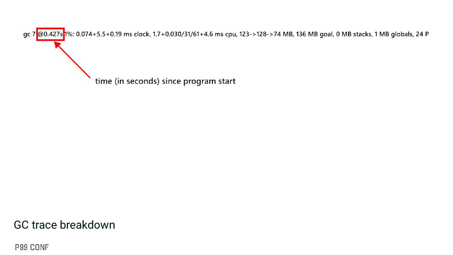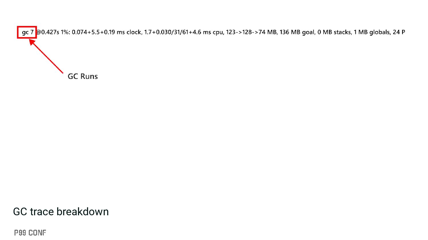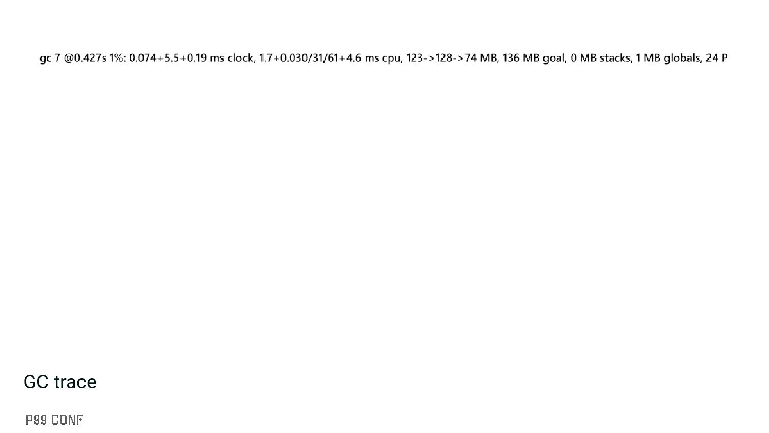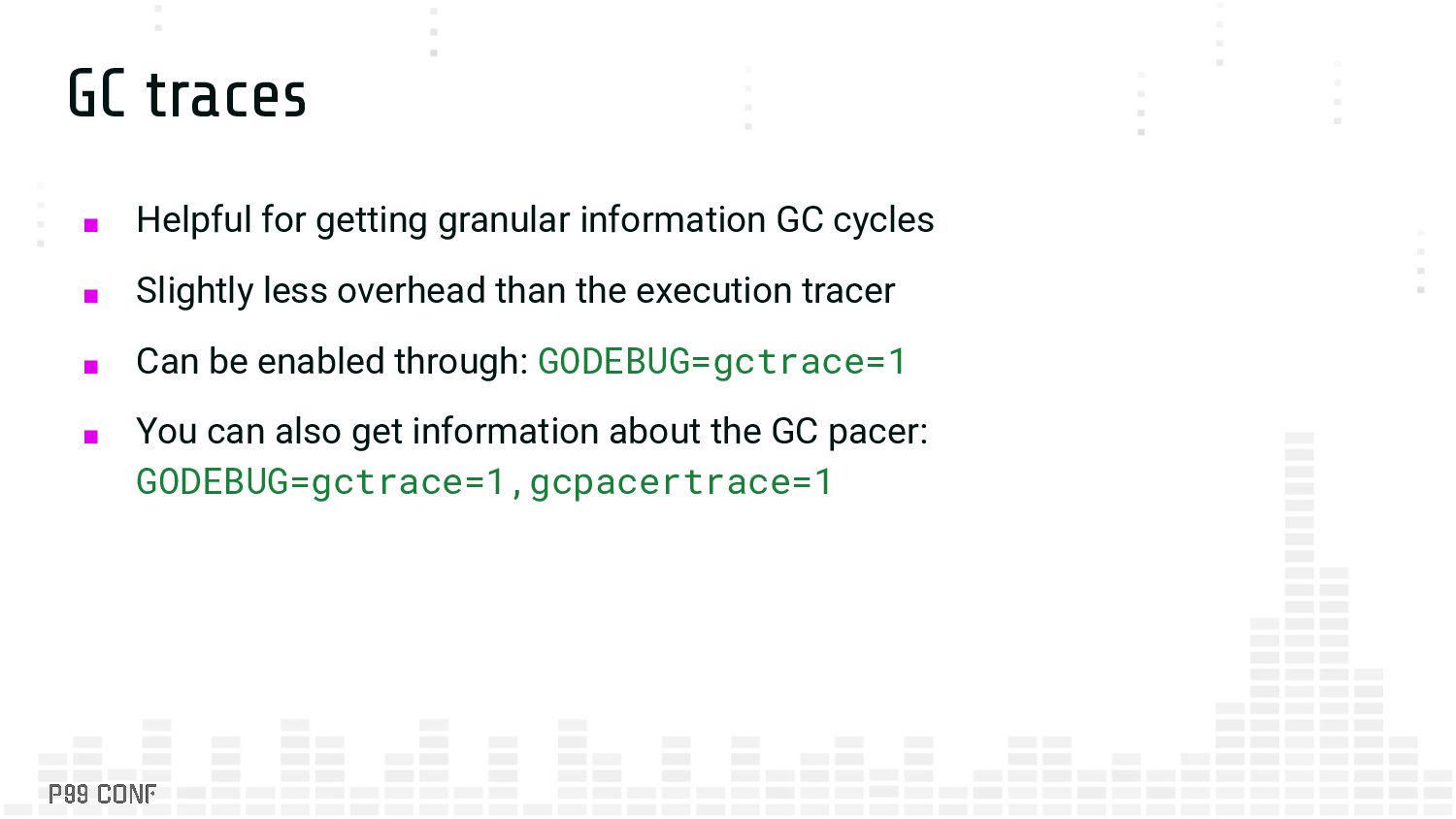 ▪ Slightly less overhead than the execution tracer ▪ Can be enabled through: GODEBUG=gctrace=1 ▪ You can also get information about the GC pacer: GODEBUG=gctrace=1,gcpacertrace=1