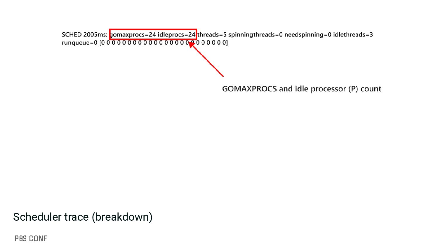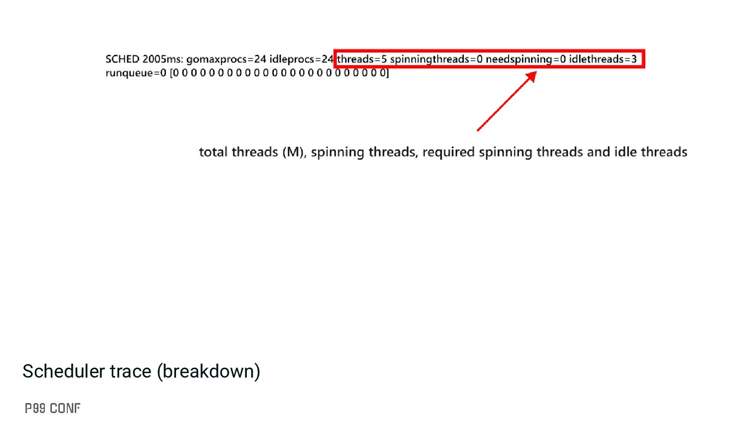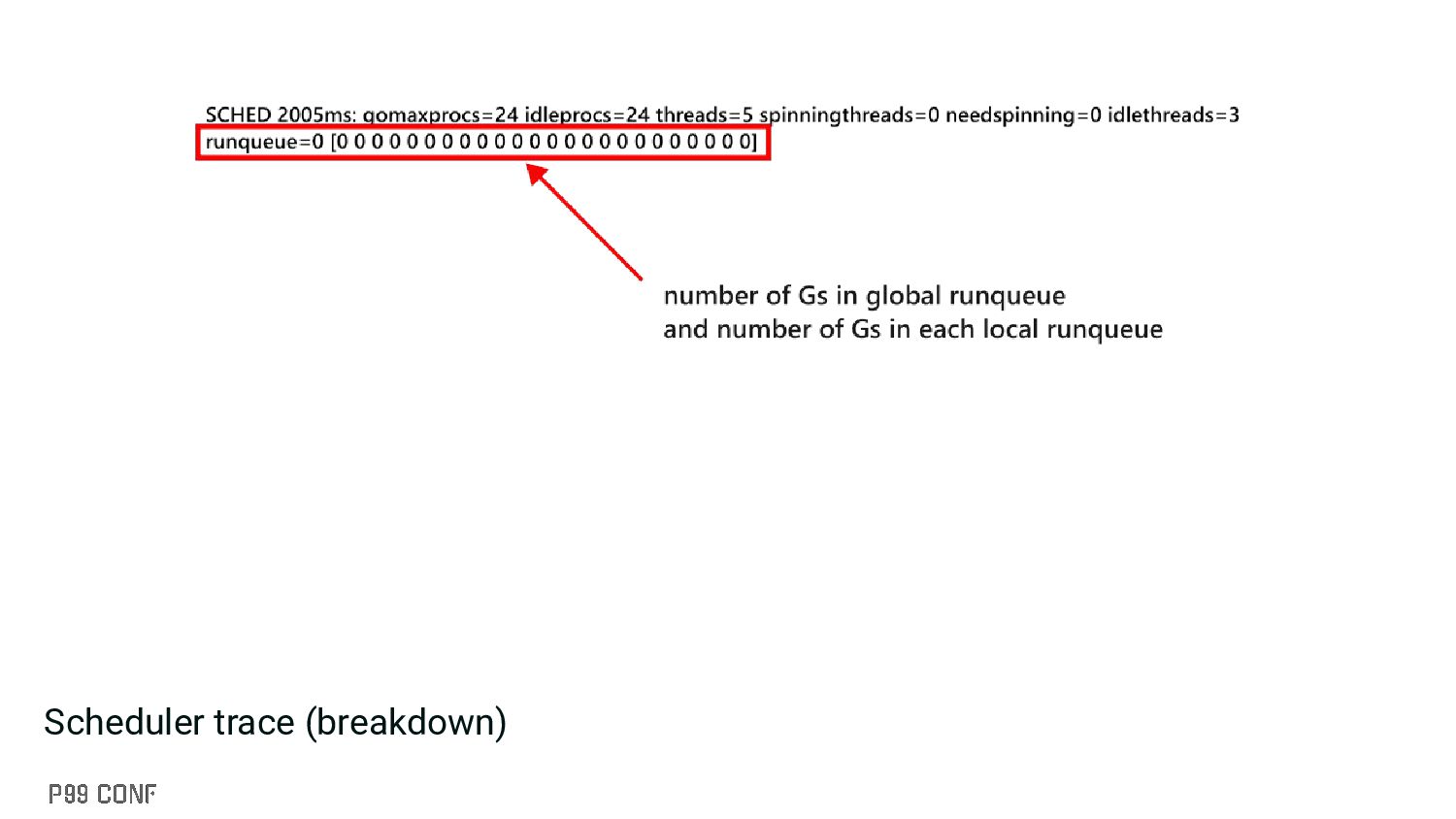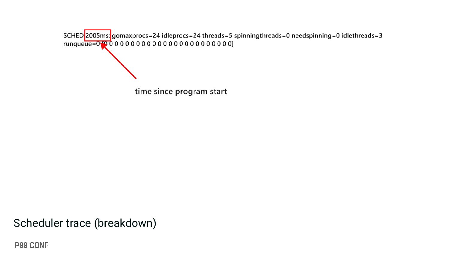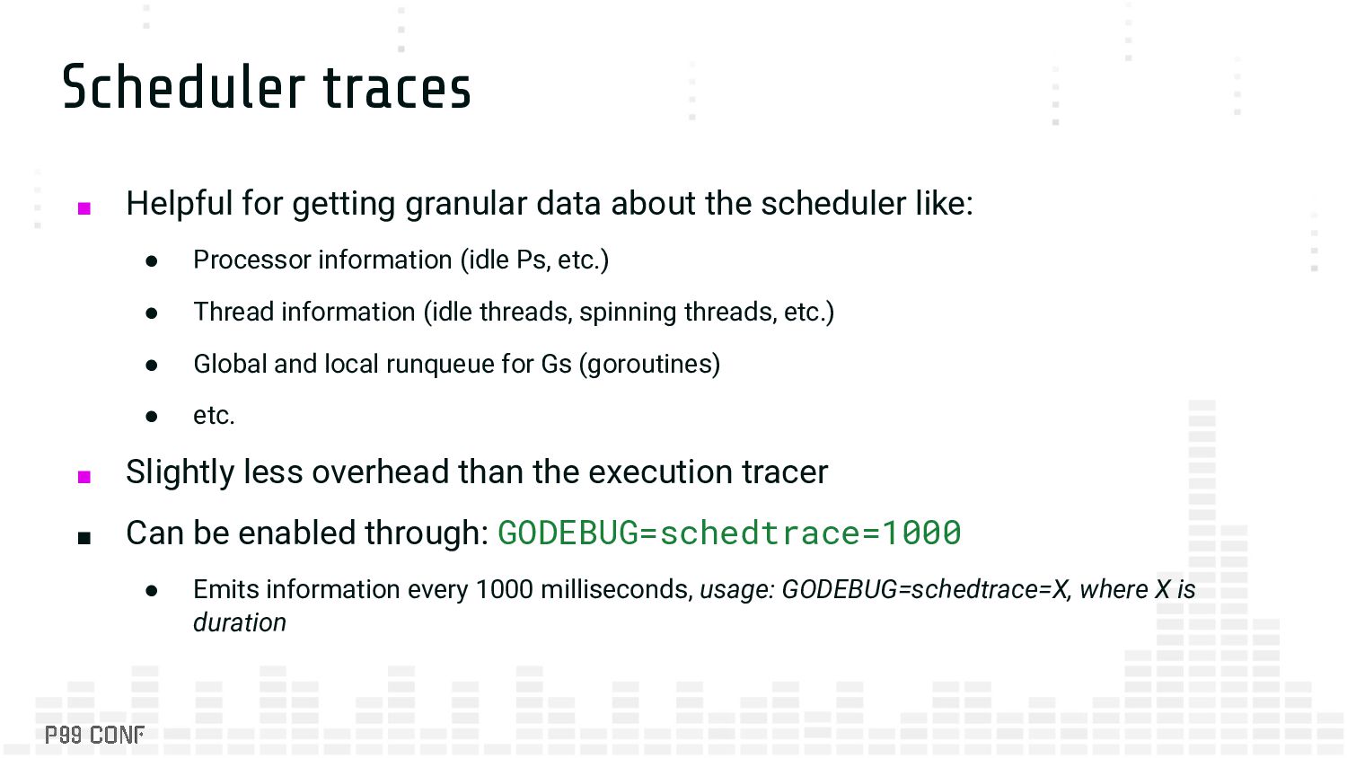 scheduler like: • Processor information (idle Ps, etc.) • Thread information (idle threads, spinning threads, etc.) • Global and local runqueue for Gs (goroutines) • etc. ▪ Slightly less overhead than the execution tracer ▪ Can be enabled through: GODEBUG=schedtrace=1000 • Emits information every 1000 milliseconds, usage: GODEBUG=schedtrace=X, where X is duration