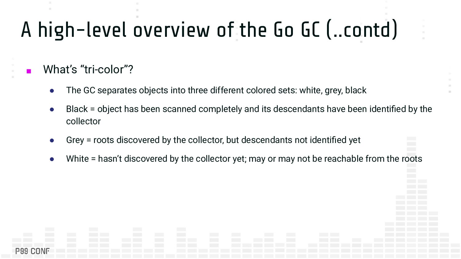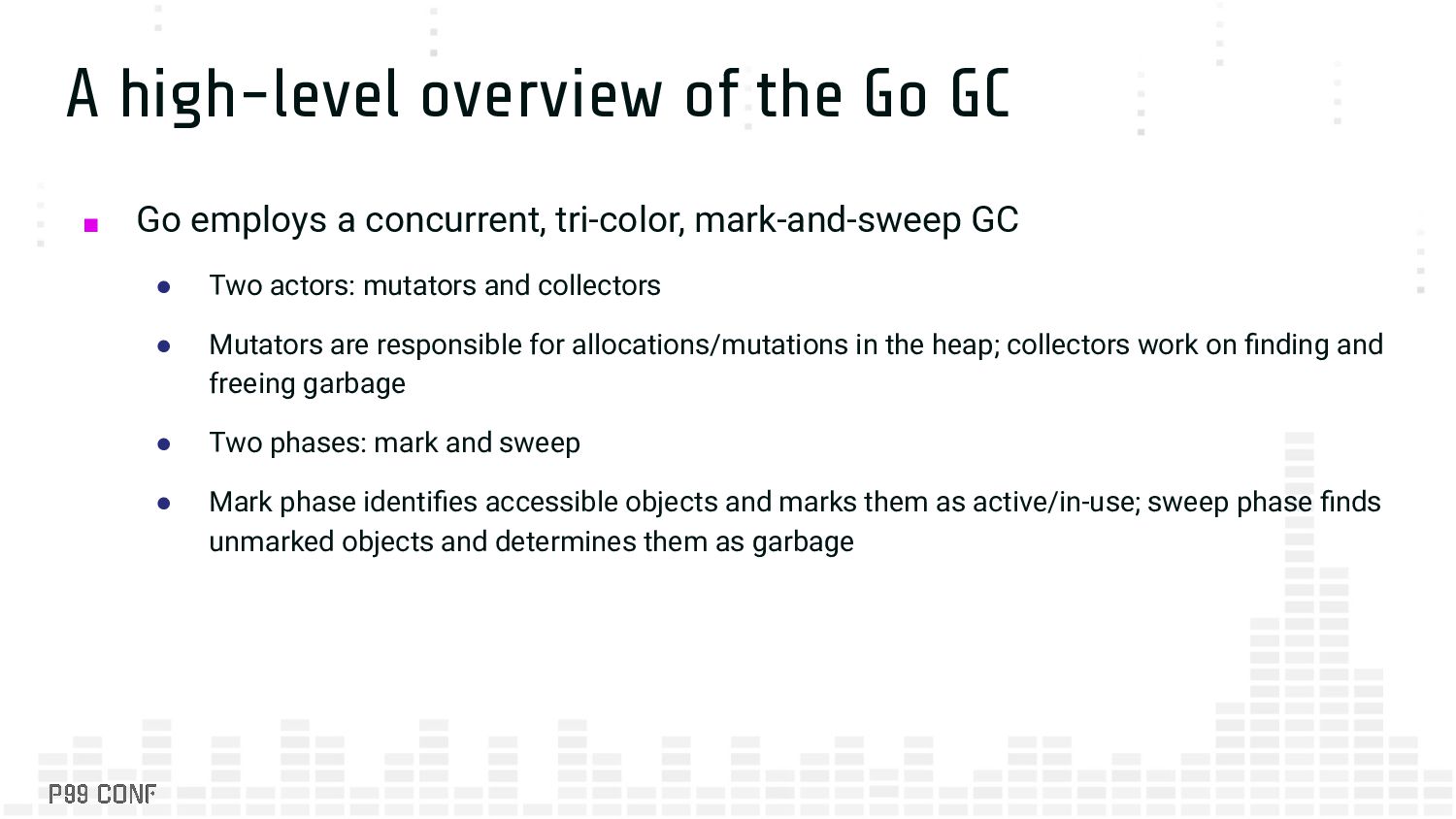 a concurrent, tri-color, mark-and-sweep GC • Two actors: mutators and collectors • Mutators are responsible for allocations/mutations in the heap; collectors work on finding and freeing garbage • Two phases: mark and sweep • Mark phase identifies accessible objects and marks them as active/in-use; sweep phase finds unmarked objects and determines them as garbage